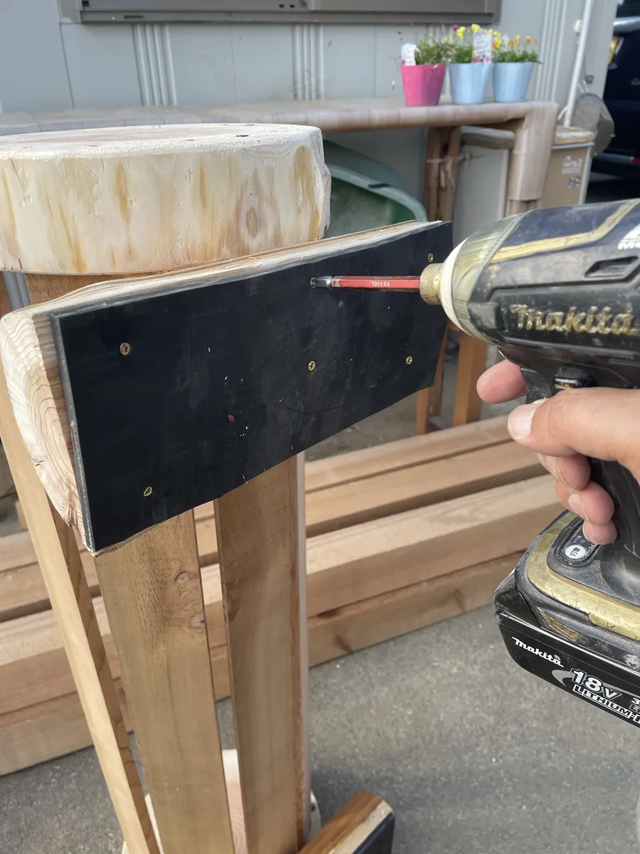 画像にはありませんがこのプランター形が丸いので固定の脚を取り付けます。ネジで取り付ける場所はここの1箇所ですが補強の板を追加しております😄