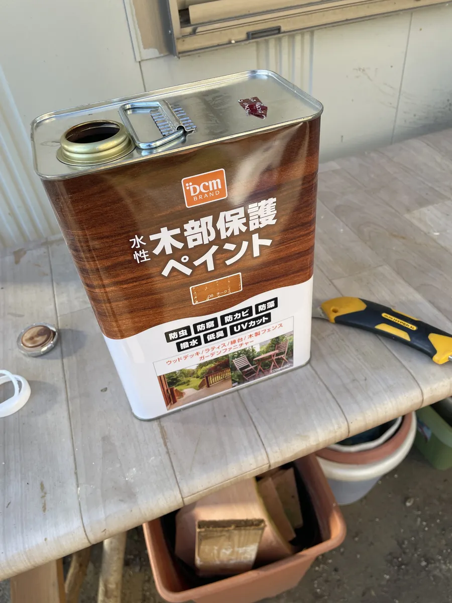 そのままだと水やりとかで板が傷むと思うので塗装を施します。こちらは見切り品で購入した水性塗料です。