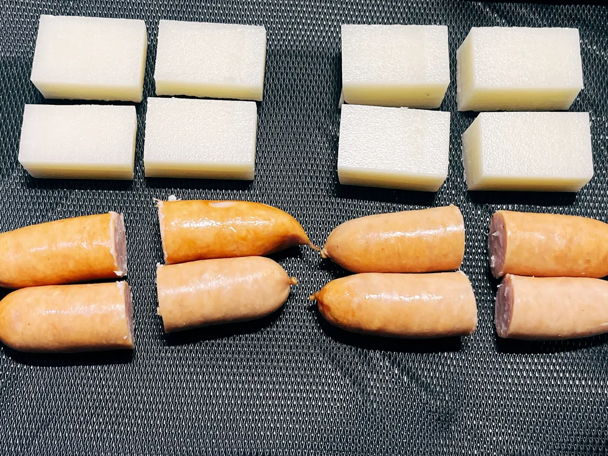 切り餅を4当分に、ウィンナーを半分に切ります。