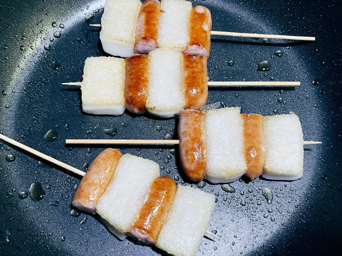 お餅が柔らかくなったら、ウィンナーと交互に刺していきます。