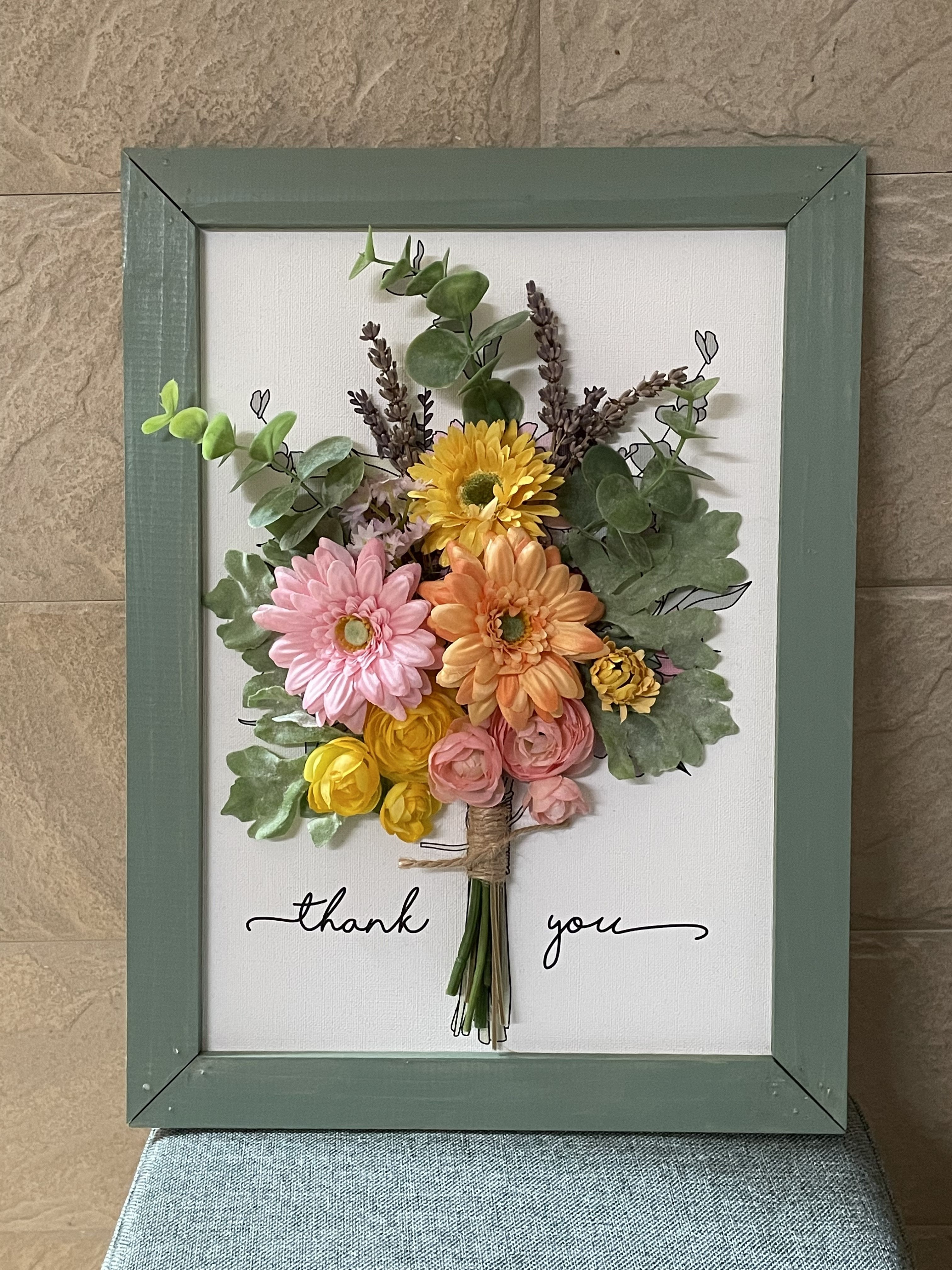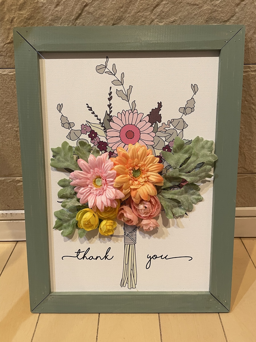 飾っていて、キャンバスの絵の残りの部分が、寂しく感じてきたので、家にある花材から、ドライフラワーとアーティシャルフラワーを追加して、さらに華やかにそして、ラベンダーの香りに癒されてます😊