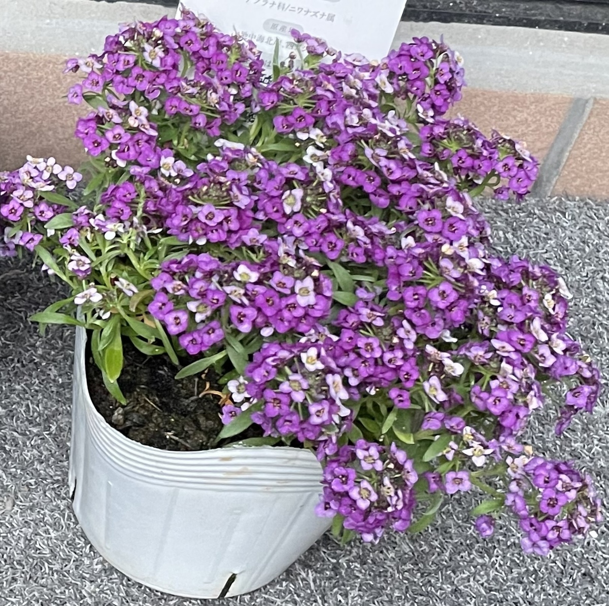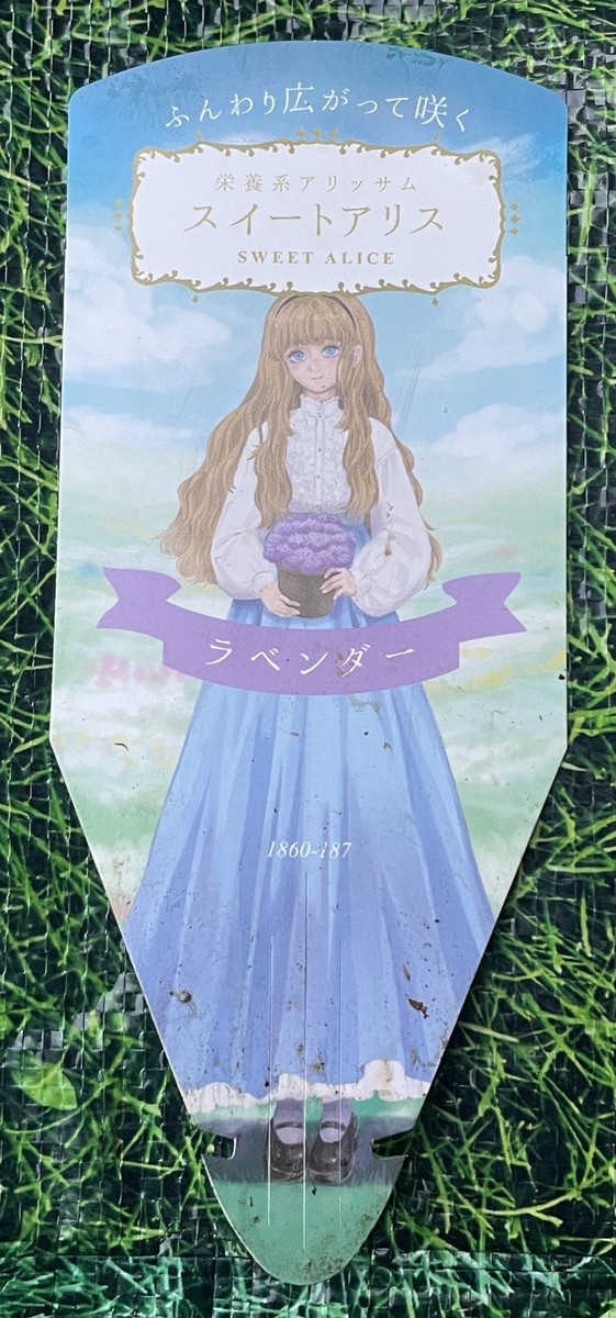 マンガのキャラのようなタグ。か弱そうな雰囲気だが、栄養系アリッサムとなってるから夏の暑さにも強い方かも。☺️