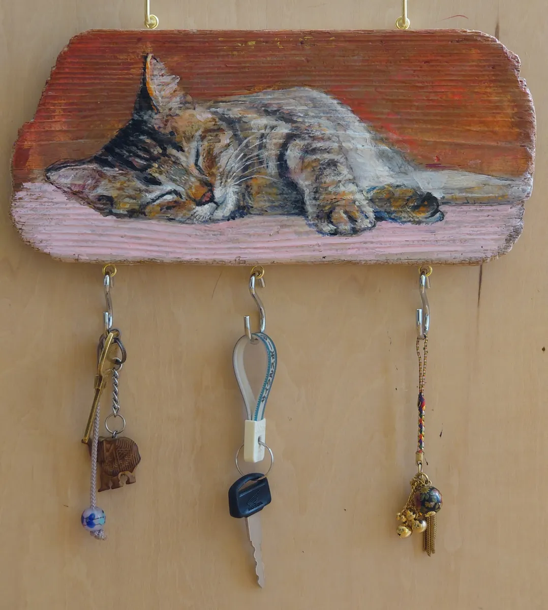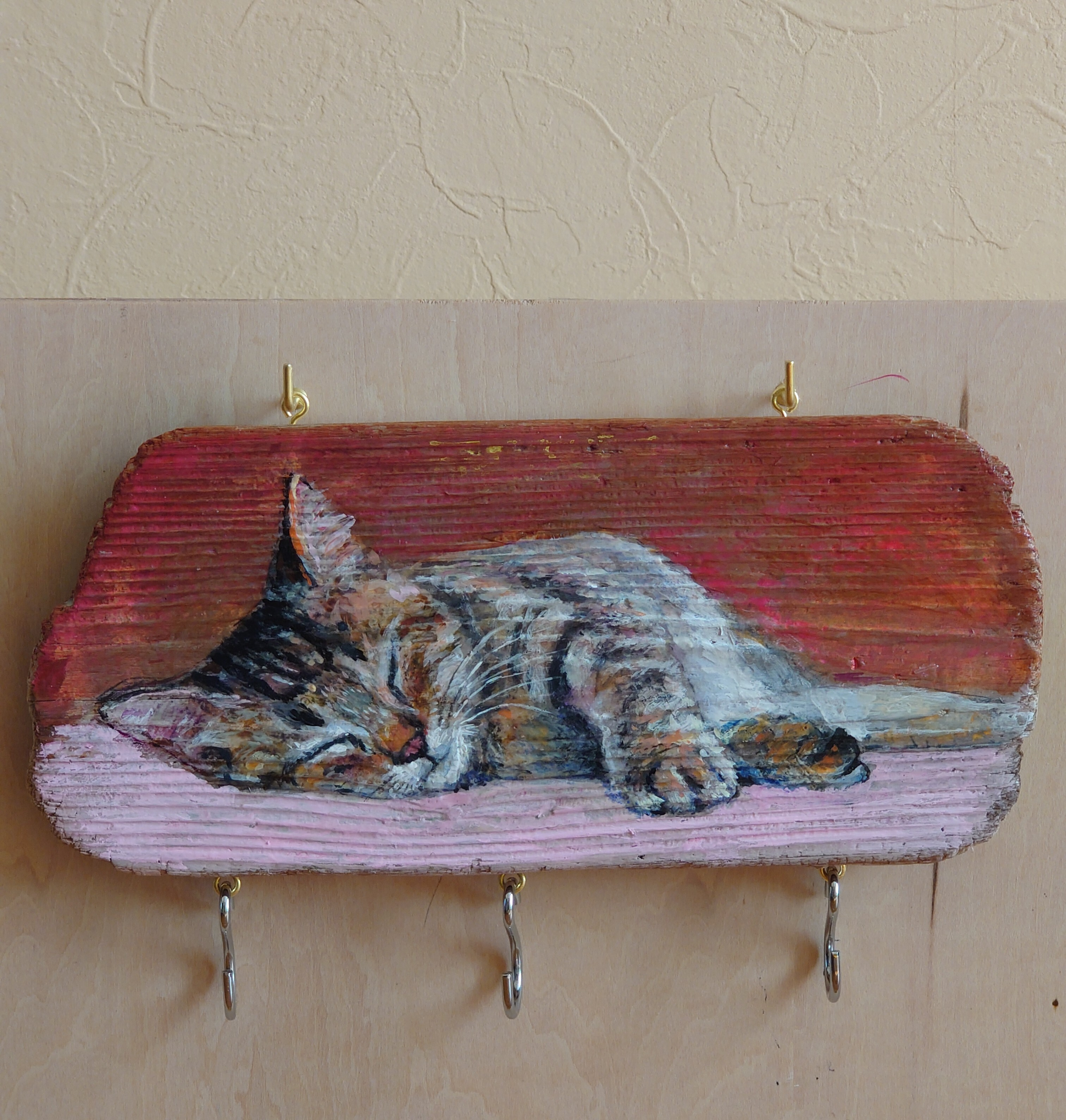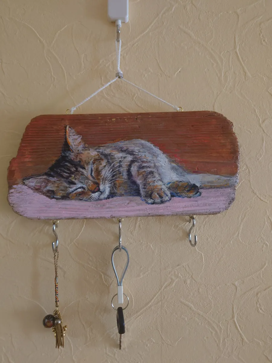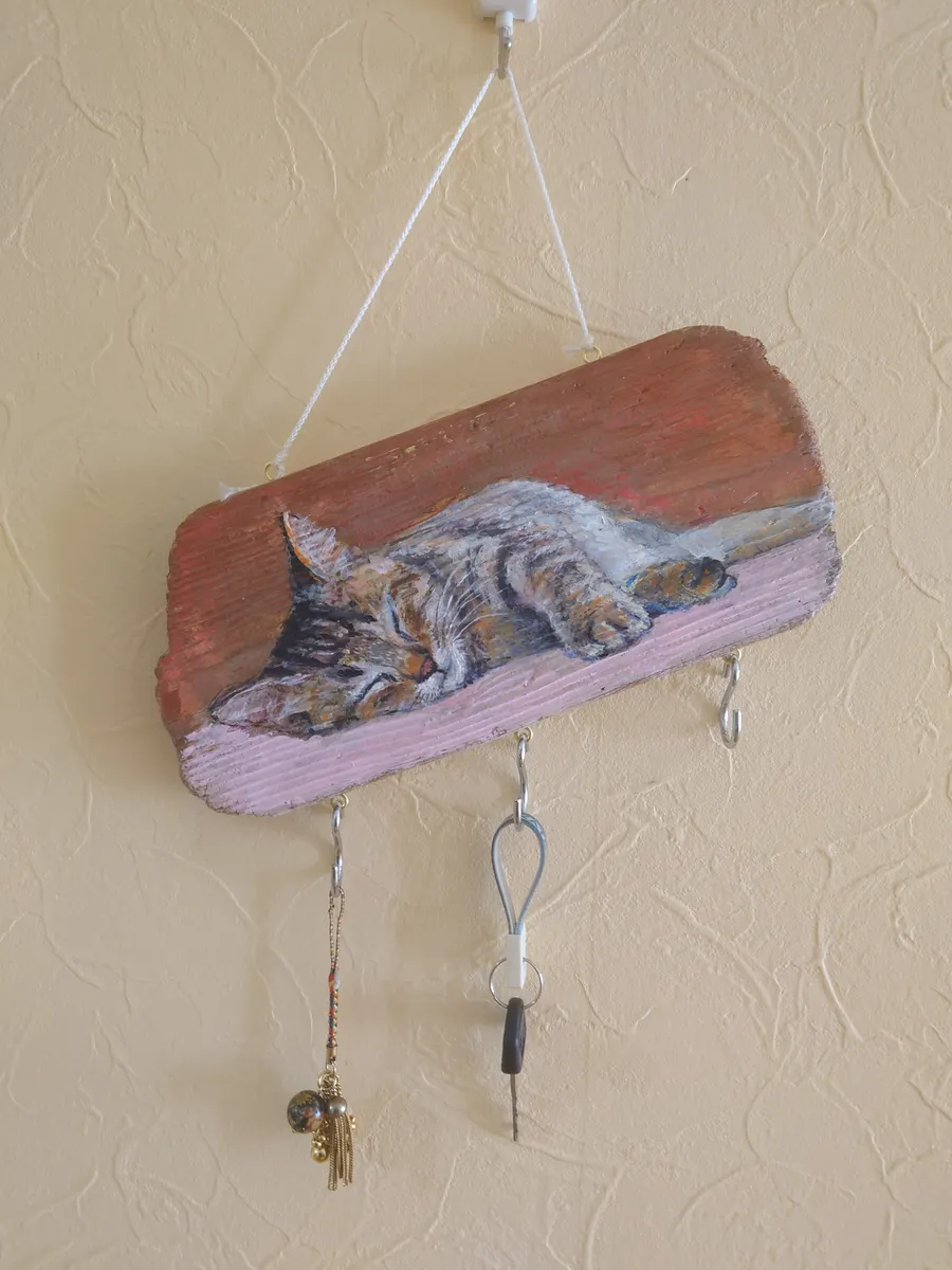 トップ > にゃん祭りDIY2026 > キャンペーン > 眠る猫ちゃんのキー🗝️フック🪝 はまサン 2026/02/23 15:21 眠る猫ちゃんのキー🗝️フック🪝 ■作品内容 キー🗝️フック🪝 ■作品のこだわりポイント 流木に眠るネコちゃんの絵を描きました。 裏に宛木とヒートン引っ掛けフックを付けました。 手を投げ出し立体的に見えるようにしました。 流木のため木目が波うってます。🌊描きにくいですねェ~。 始めは紐で下げましたがバランスが崩れ 紐中央を縛りバランスをとりましたが……全体が揺れるので固定する事に。 L字フックネジで固定しました。✨ 小物雑貨部門【にゃん祭りDIY2026】 いいね 共有する 共有する X LINE リンクをコピー コメントする 5 件の返信 (新着順) ミュートしたユーザーの投稿です。 投稿を表示 ダンボ 2026/03/11 09:39 めっちゃ可愛くて素敵です! いいね 返信する ミュートしたユーザーの投稿です。 投稿を表示 はまサン 2026/03/11 11:57 ダンボ ダンボさん ありがとうございます😊 嬉しいです😊 いいね 返信する ミュートしたユーザーの投稿です。 投稿を表示 シン ひよっこ 葵 2026/03/05 20:46 はまサンさん、こんばんは なんとすてきなねこちゃん✨ すてきですねぇ(人´ω`) いいね 返信する ミュートしたユーザーの投稿です。 投稿を表示 はまサン 2026/03/05 23:47 シン ひよっこ 葵 ありがとうございます😊 褒めてくださり、たいへん嬉しいです😀 いいね 返信する ミュートしたユーザーの投稿です。 投稿を表示 tsuyo_maru 2026/02/28 17:21 すやすや眠る猫ちゃん。楽しい夢を見ているのでしょうね。 木目の味わいが良い感じです✨✨ 素敵な作品に仕上がりましたね💖 いいね 返信する ミュートしたユーザーの投稿です。 投稿を表示 はまサン 2026/02/28 20:08 tsuyo_maru tsuyo_maruさんありがとうございます✨😀 この猫ちゃんの口元に小さな節があって木目が、少したわむ感じが丁度猫ちゃんの顔が沈んでいるように見えますかね?🤔実はたまたまそうなっただけですが😅 猫ちゃんの寝顔が好きです。😀 いいね 返信する ミュートしたユーザーの投稿です。 投稿を表示 ラルチャエ 2026/02/23 19:50 お上手ですね😍 リアルすぎ可愛い〜ィ💞💞 いいね 返信する ミュートしたユーザーの投稿です。 投稿を表示 はまサン 2026/02/23 21:08 ラルチャエ ありがとうございます✨ たいへん嬉しいです✨😊 いいね 返信する ミュートしたユーザーの投稿です。 投稿を表示 Milk 2026/02/23 15:23 とっても可愛いですね💕 寝てる猫ちゃん癒されます☺️ 猫ちゃんがリアルで、絵お上手ですね〜✨ いいね 返信する ミュートしたユーザーの投稿です。 投稿を表示 はまサン 2026/02/23 15:31 Milk ありがとうございま😊 寝ている猫ちゃん穏やかですね✨😺 手が前に出てくるような感じにしてます。😊 いいね 返信する