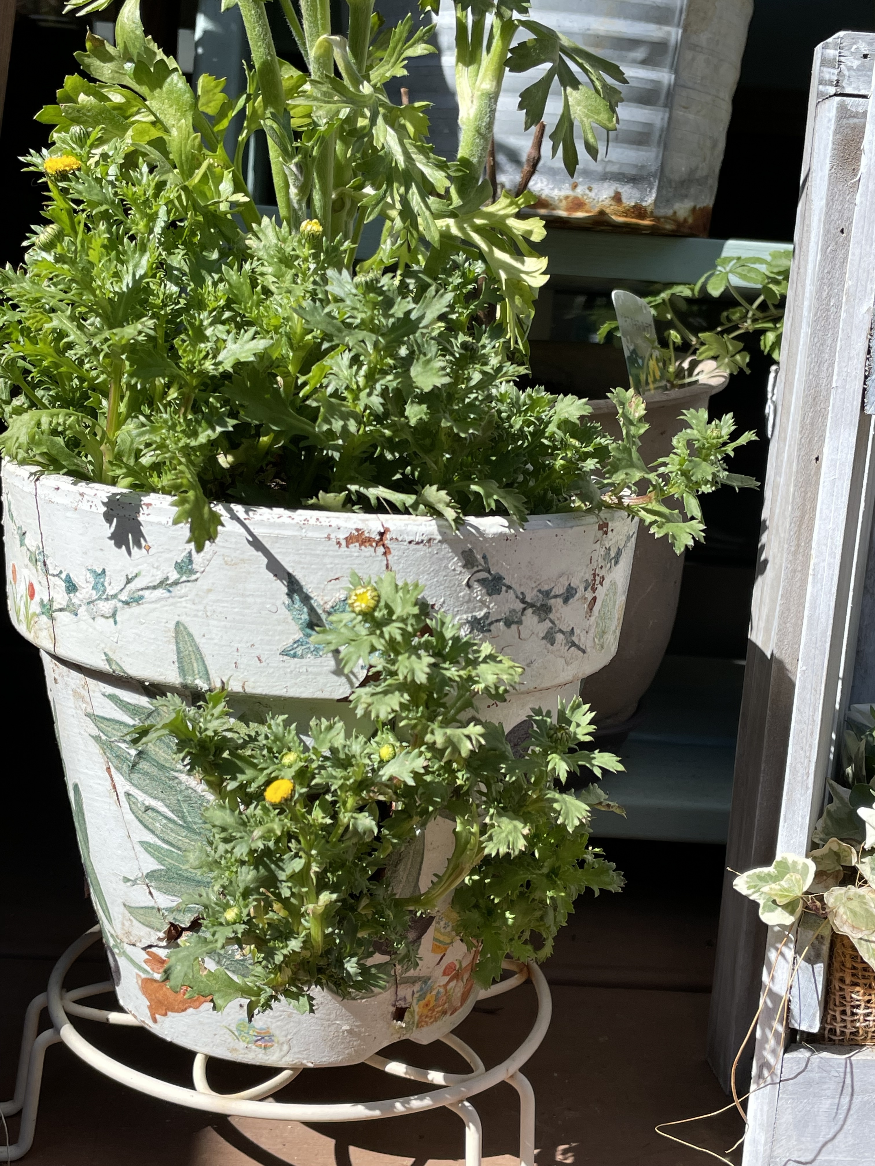 強風で割れた鉢をボンドでくっつけて、スリット鉢風にして、ノースポールを植えましたが,隙間から,出したので、根がちゃんと張って元気になるか心配でしたが,蕾も膨らんで,上を向いてきました。なんとか元気に頑張ってます😀