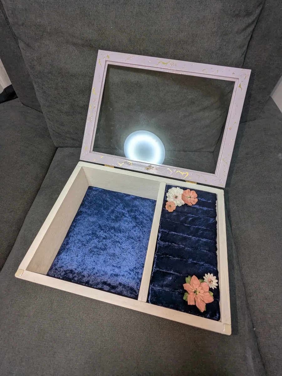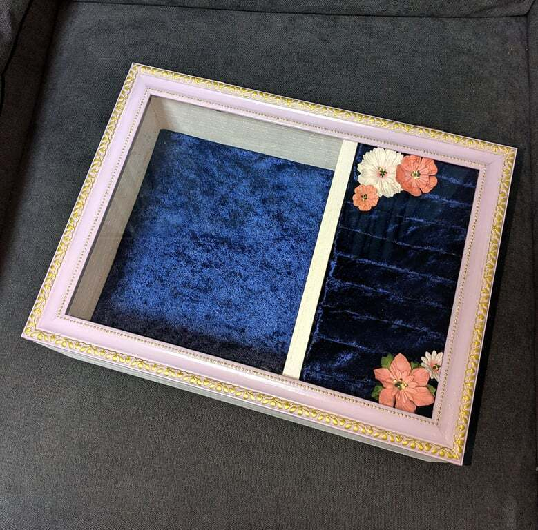 投稿を表示淡い色の小物入れに青のベルベットが素敵ですね✨お花の色合いも素敵💕