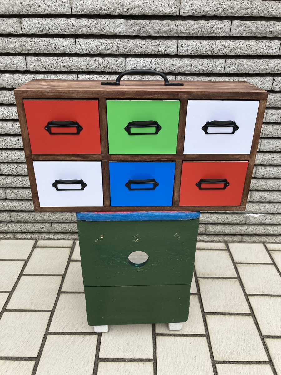 1/17にWSで6ドロワーに参加、一名だった事も有り二時間で組み立てが完了しましたが、六箱の色塗りの選定に迷い、結果、二箱に白を塗り持ち帰り、やっとアレンジが出来ました。