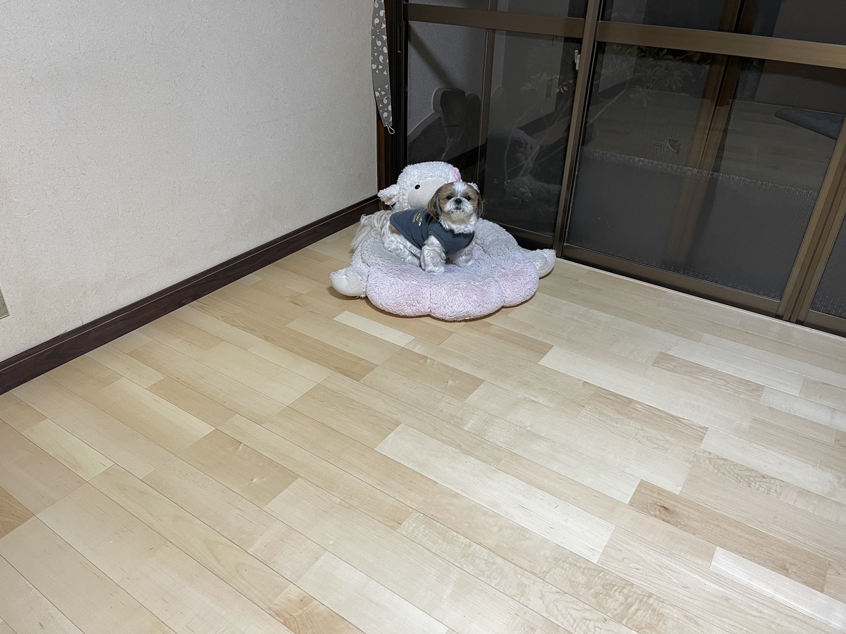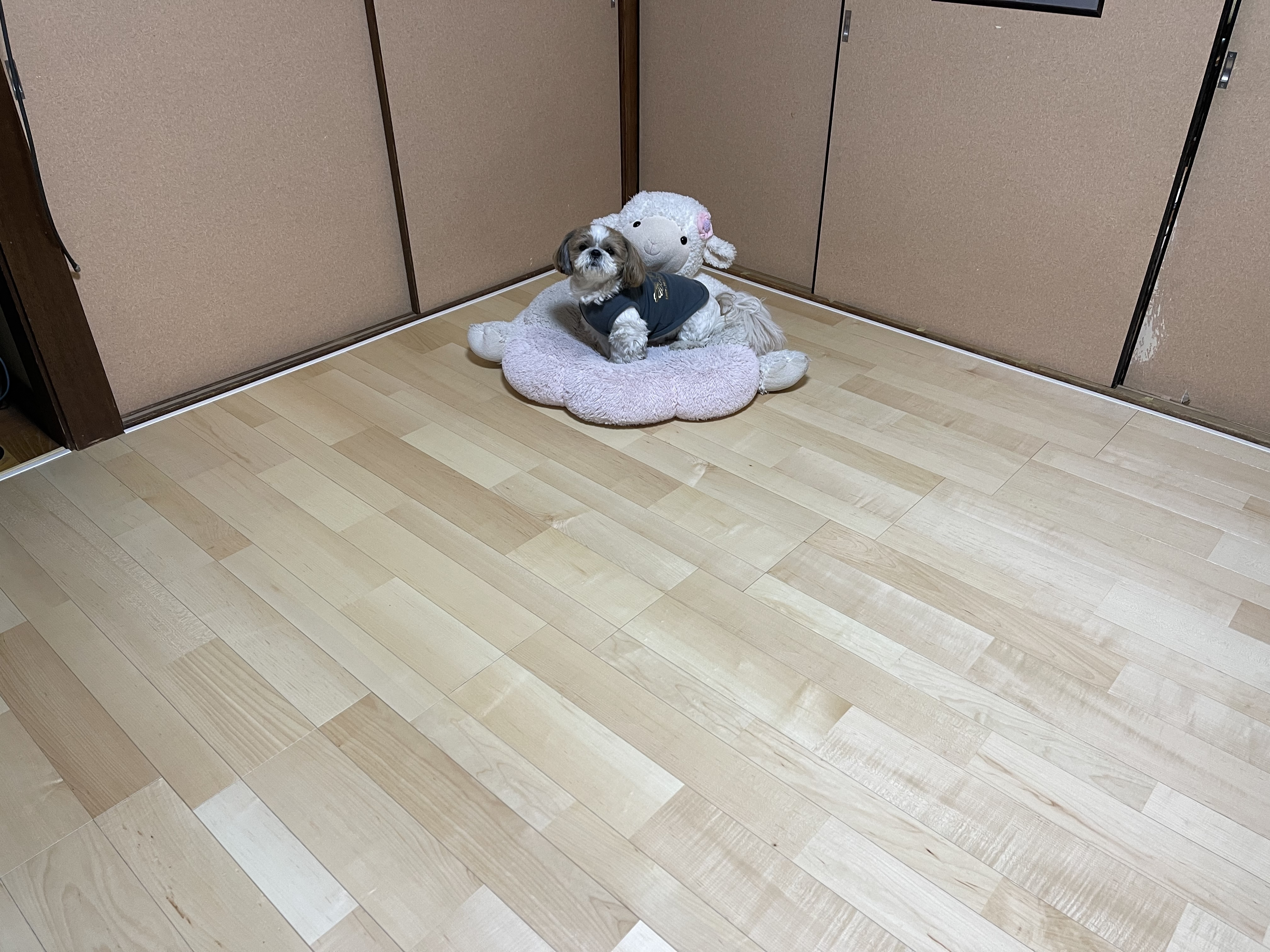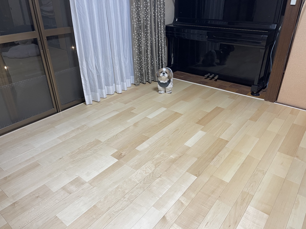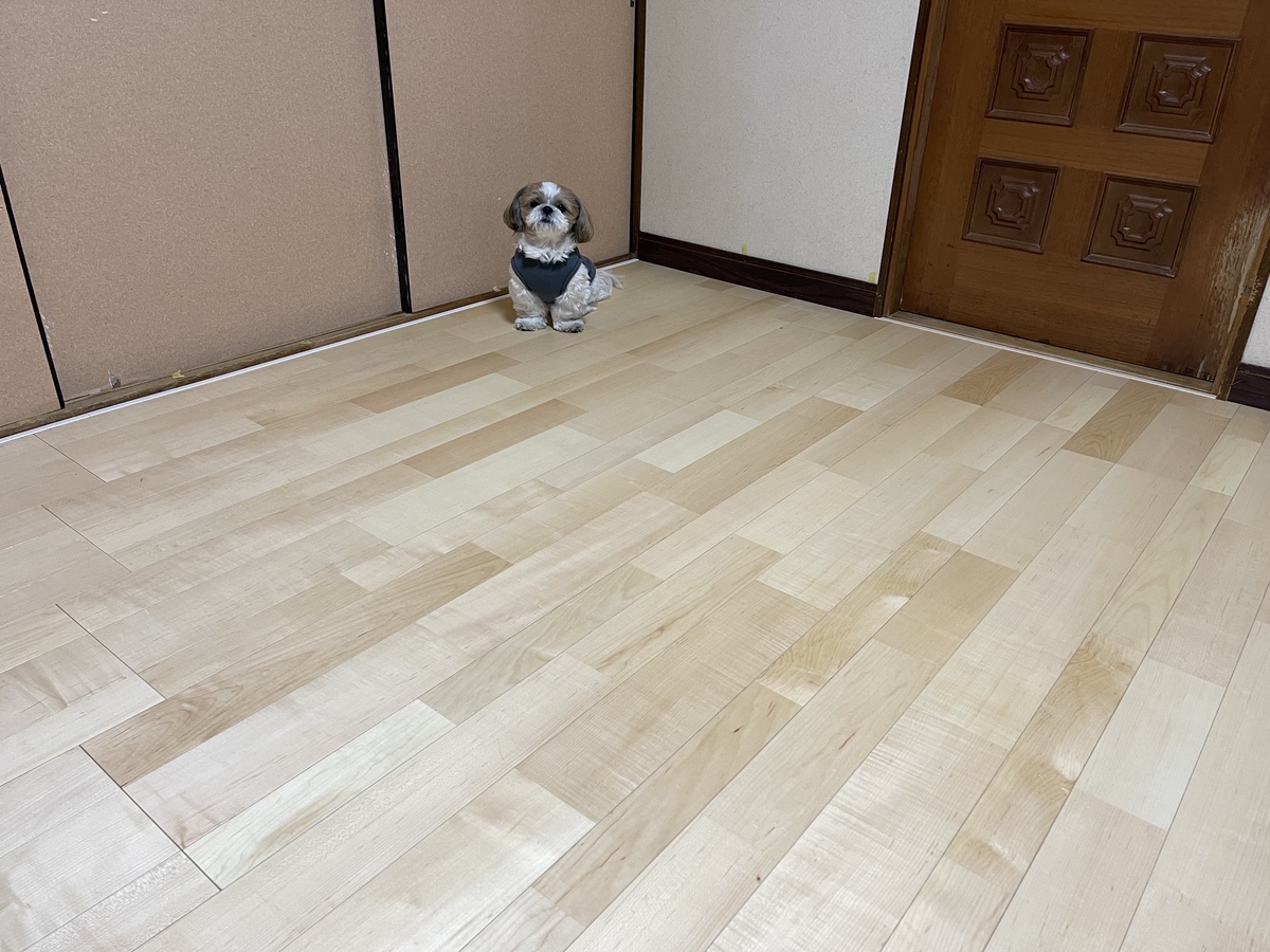 お美しく明るいフローリングと、床ではなくカメラ目線がキマっているいつもの現場監督っ🤣📸🐶✨