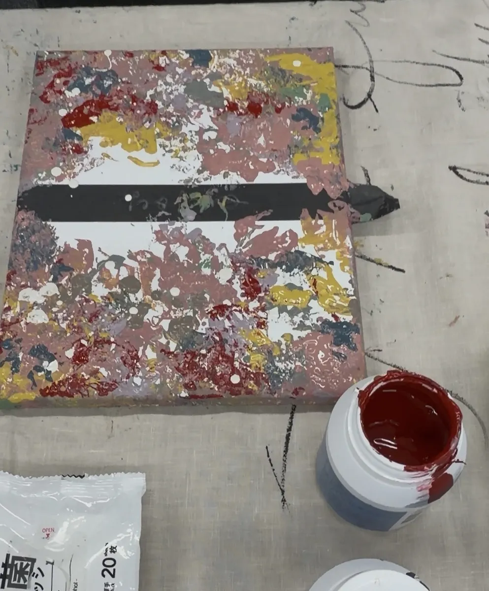 選んだ真っ白なキャンバスにペイントしていくのですが、筆は使わずくしゃっとした紙でペイントします。好きな色を好きな位置に。