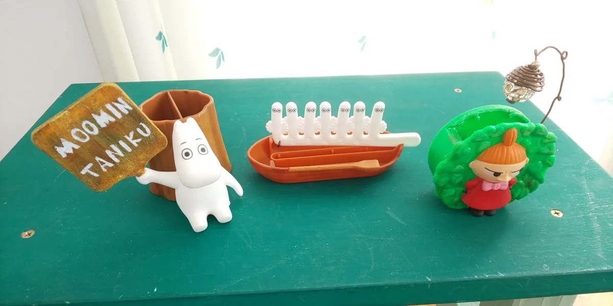 ムーミンの歯ブラシホルダー、ニョロニョロのボートヘアーコーム、ミィのロールシール入れ