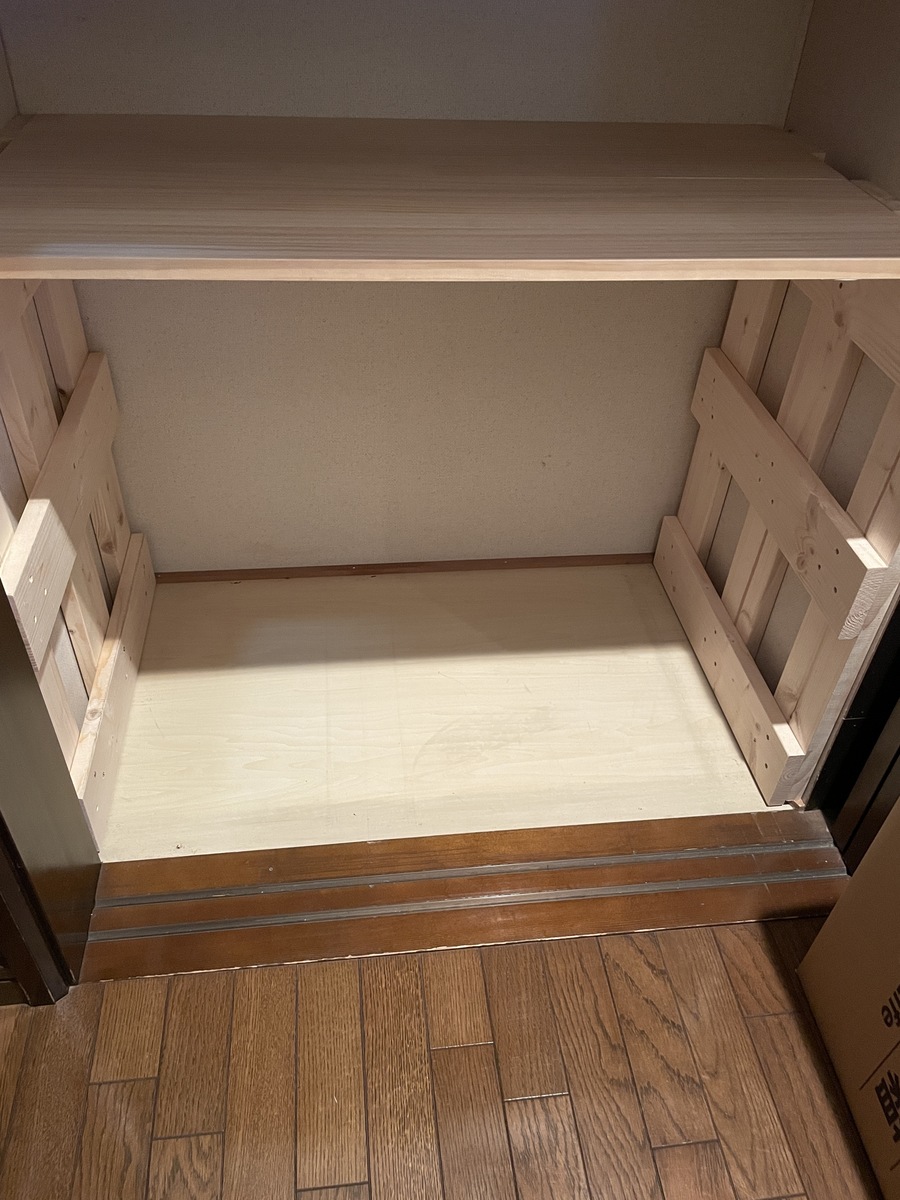 仕切りのない物入れにすのこを2枚作り物入れの両サイドに置き、間に棚板を設置し3段にしました。