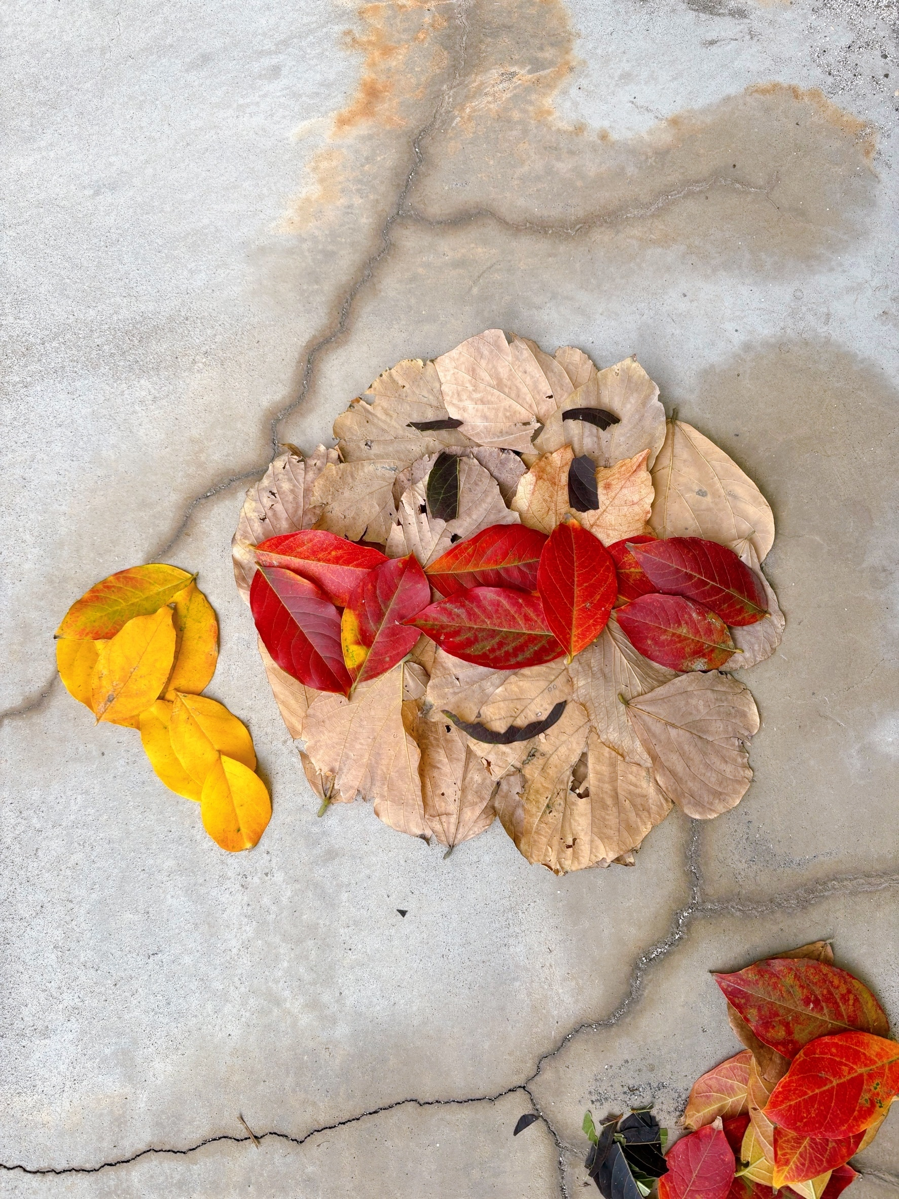 うちの子が、枯葉でアンパンマンを作りました🍁🍂 左の黄色の葉はアンパンマンの手👊だよ😆
