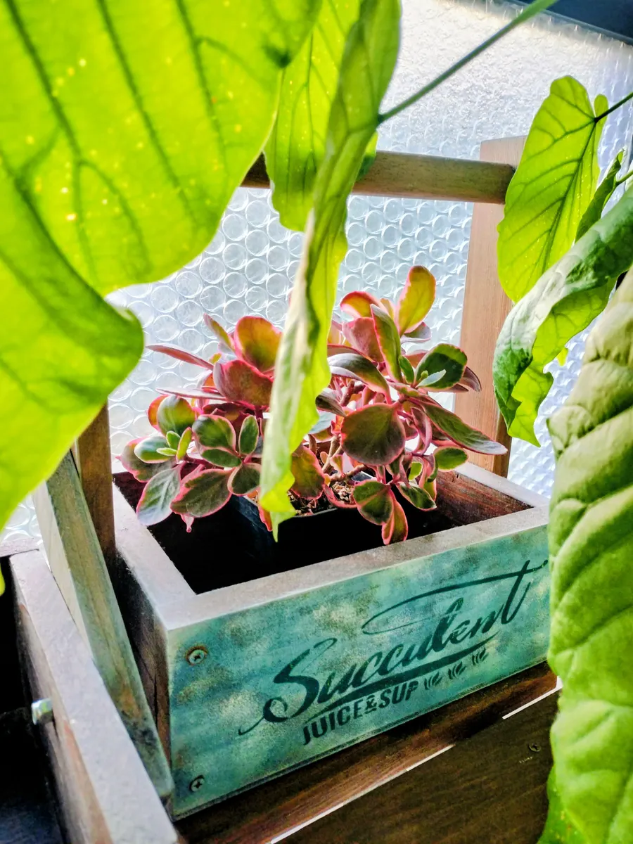 このジャングルのような合間に先日植物くじで当てたカランコエ ポエール。寒さに弱いと聞いたので家の中で。