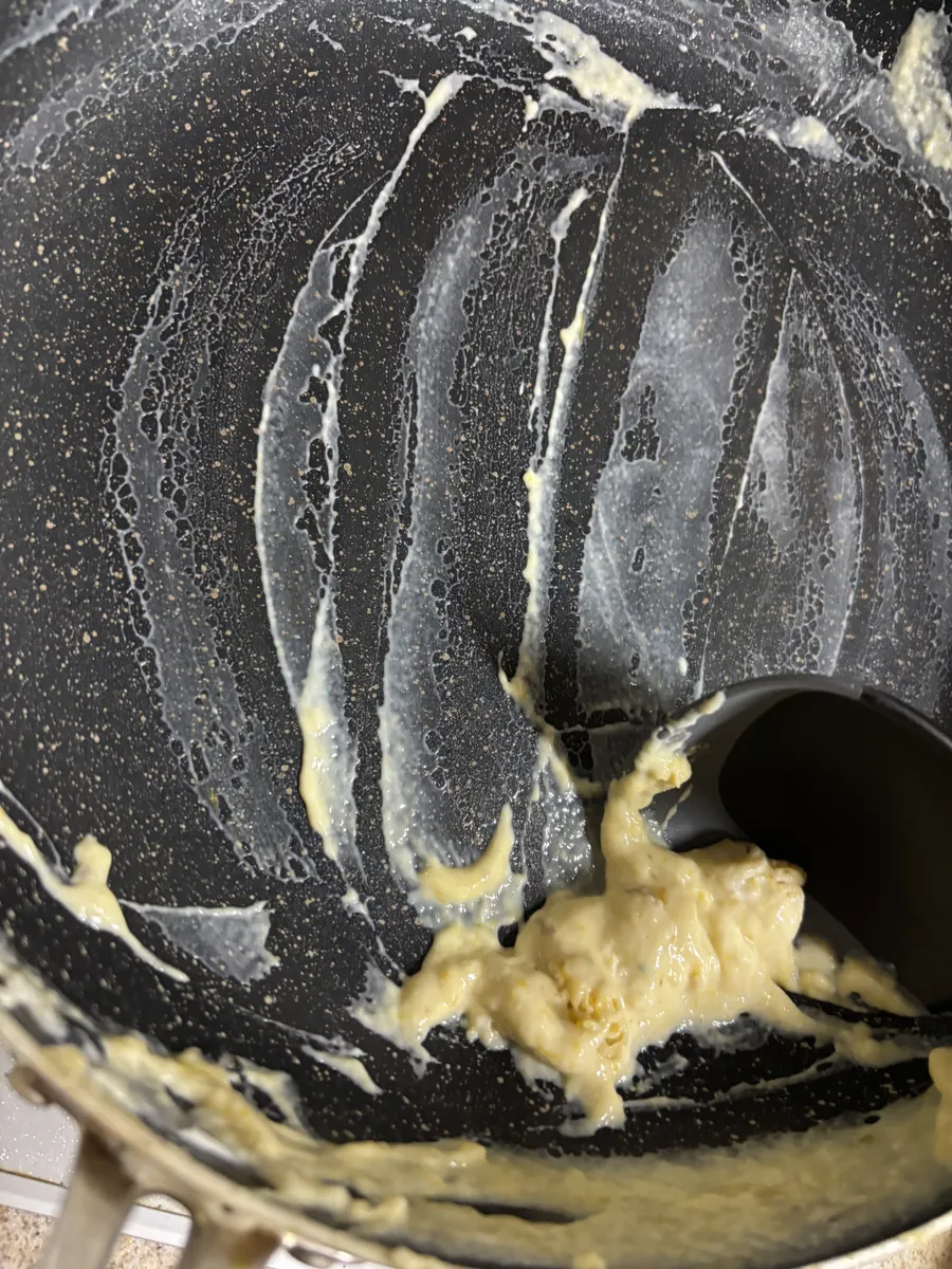 わかににくいのですが、、「くらしにら、ら、ら」の展示会でコジマジックさんに紹介してもらった"先がつかないスクレーパー付きお玉"を使ってフライパンからすくい皿に移し替えましたが、こんな感じできれいにすくえます。