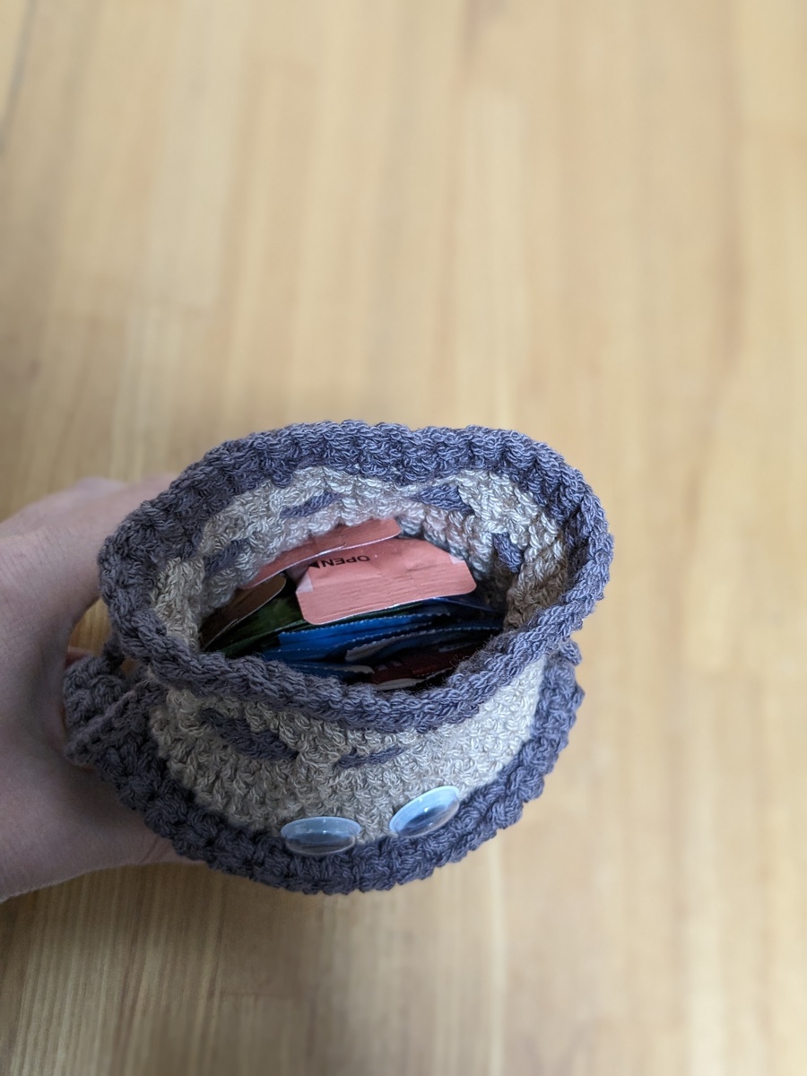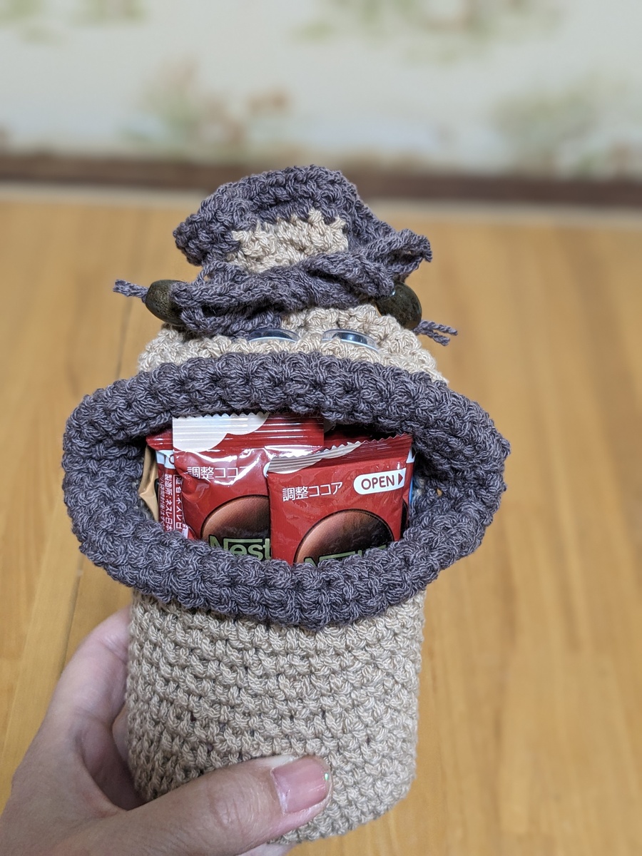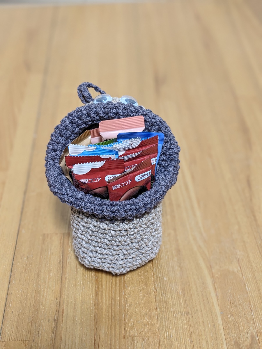 あとは紐を編んで通して口編んで目をつけたら終わり😊