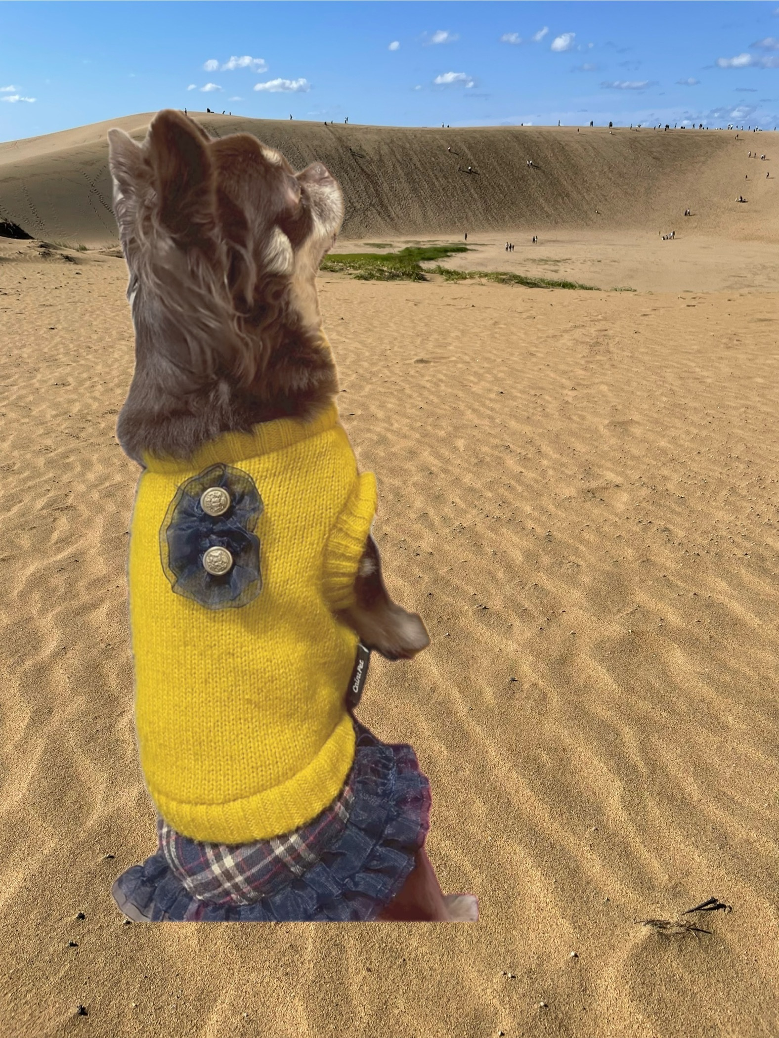 セーターの黄色にボタンやレースが映えますね。胴が長めなのでアレンジすると良いのかもしれません。参考になりました👏