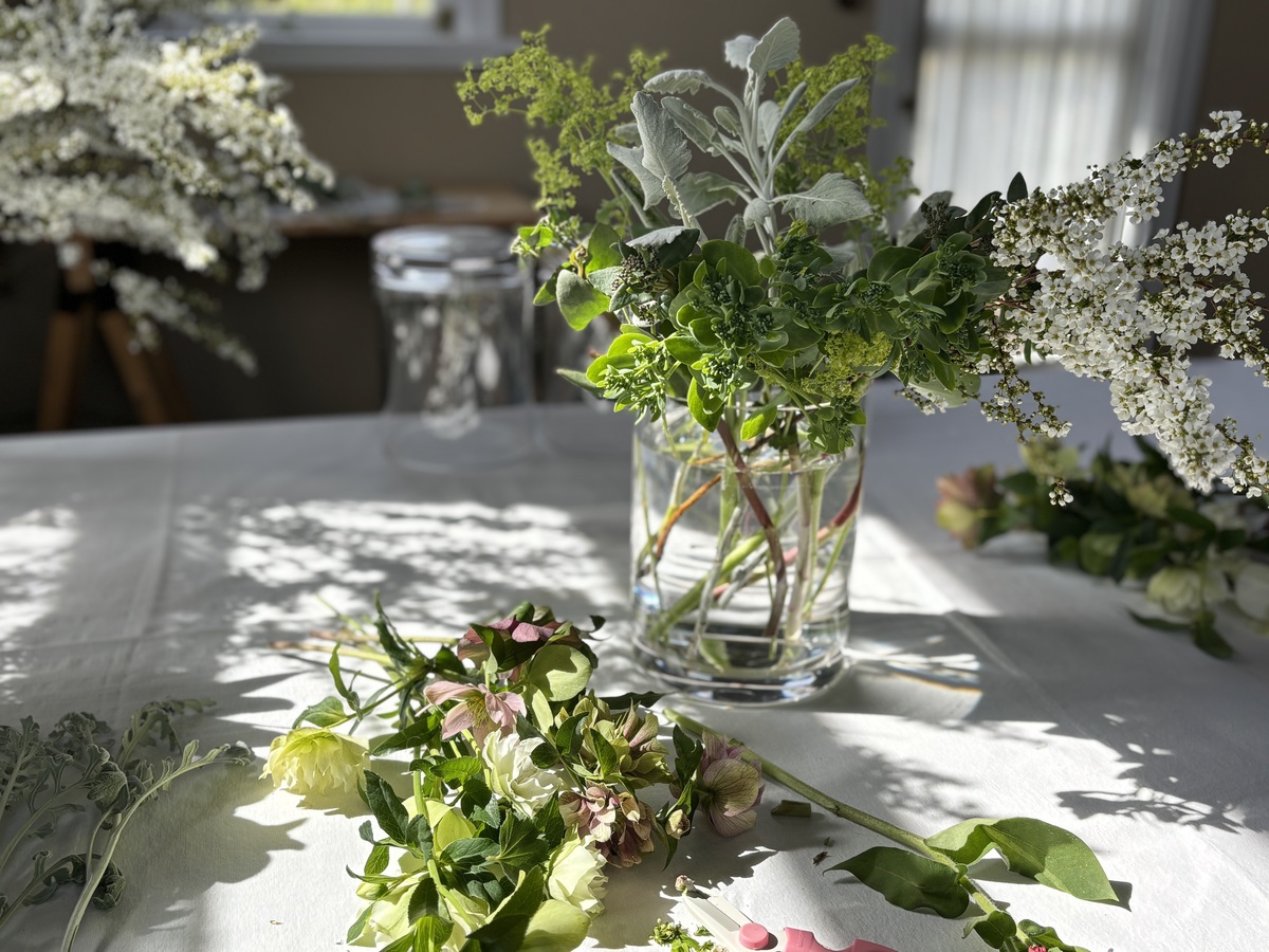 ぐいっと真っ直ぐにいけたくなるところを、先生に習うと、摘み取るときにあった雰囲気のままのいけ方になりました♪