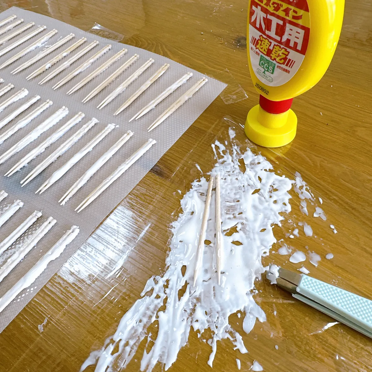 (映えない写真ですが😅)ニット帽編み機の毛糸を巻く部分を作っています🧶楊枝を2本ずつボンドで貼り合わせています。 8月に新しい家族が増える"かも"しれないので("かも"とは、1週間体験してからお迎えするか決めるので、お迎え出来ない事もあるため"かも"と書きました)なので、まだ決定ではないのに、気持ち的には、もうお迎えする気分になってしまい😅、お迎えしたら頭にかぶせる為に自作のニット帽編み機を作っている途中です。一度に作れないので、今後、途中経過を載せますが、ポイント稼ぎではありません(あのスクエアの注意喚起以来、ポイント稼ぎの投稿ではないか?と思われやしないかと戦々恐々しています)ニット帽専用編み機も売っているのですが、私の作るのは特殊なニット帽なので 編み機も手作りしかなく、頑張って作っている途中です🧶…そんな感じですが、これからの投稿も見て頂けたら嬉しいです☺️