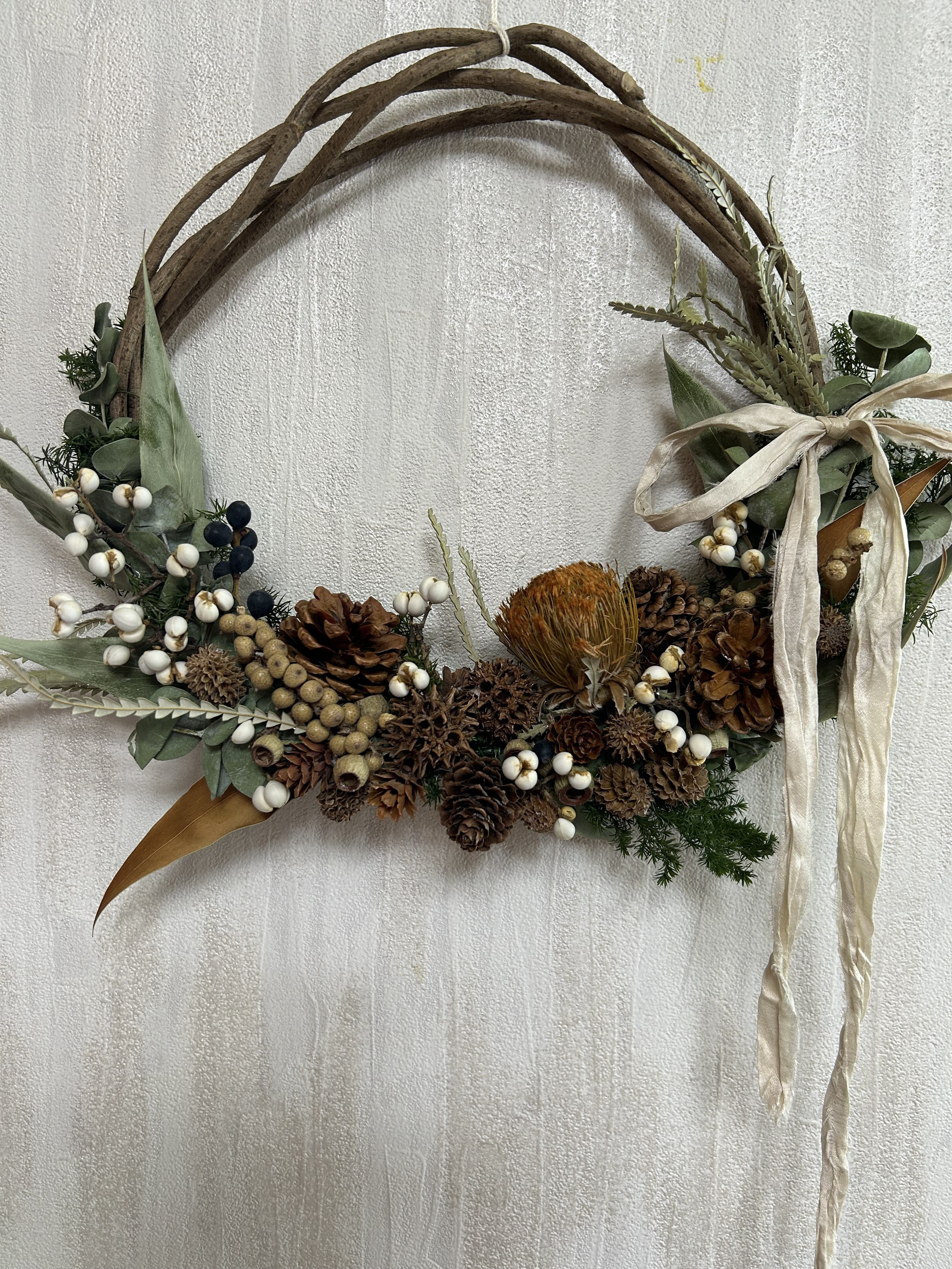 クズのつるできた土台のリースはいろいろな形があり、選ぶ形によって感じが変わる⁉️