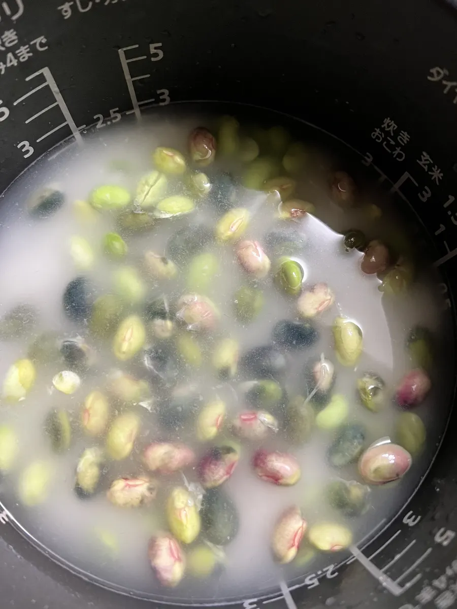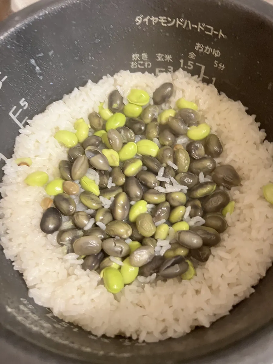 茹でた豆をご飯に混ぜるものが多いですが生のお豆を一緒に炊く方が香りもあり、美味しいと思います😋