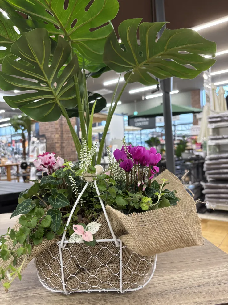小さいカゴにシクラメン、カルーナ、バコパをバランスよく植えるのは大変でした スタッフの方のアドバイスで綺麗にできました