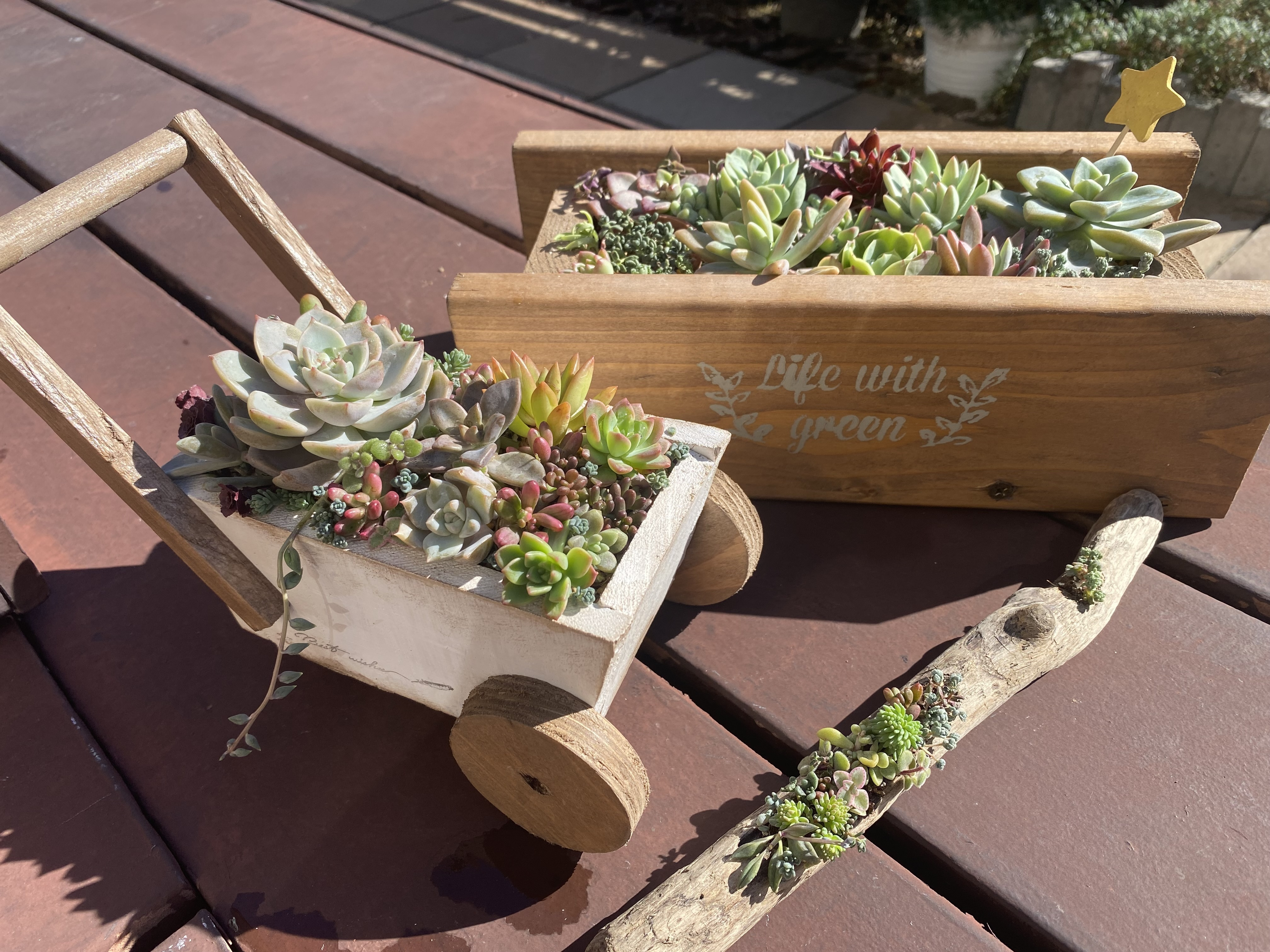 端材で作ったプランターとカート🛒に植えた多肉さんたち🌵今日はお天気☀️がいいのでお水をあげてひなたぼっこです😊流木に植えた多肉さんも何とか頑張ってくれてます👍