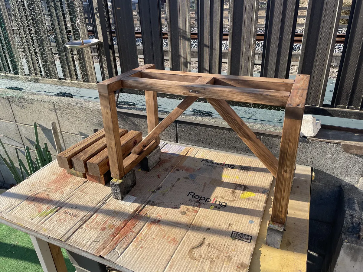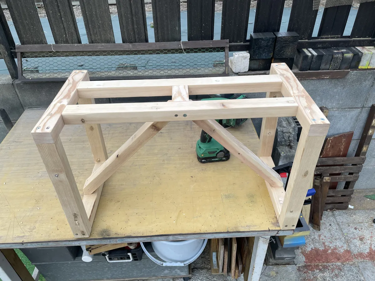 ↓脚部は全て作り直しました。素材は、先日無料木材提供でいただいてきた野縁材(リンク→ https://diy-square.cainz.com/chats/aonlngk1gvaleo5v )をビス穴を埋めて再利用しました。
