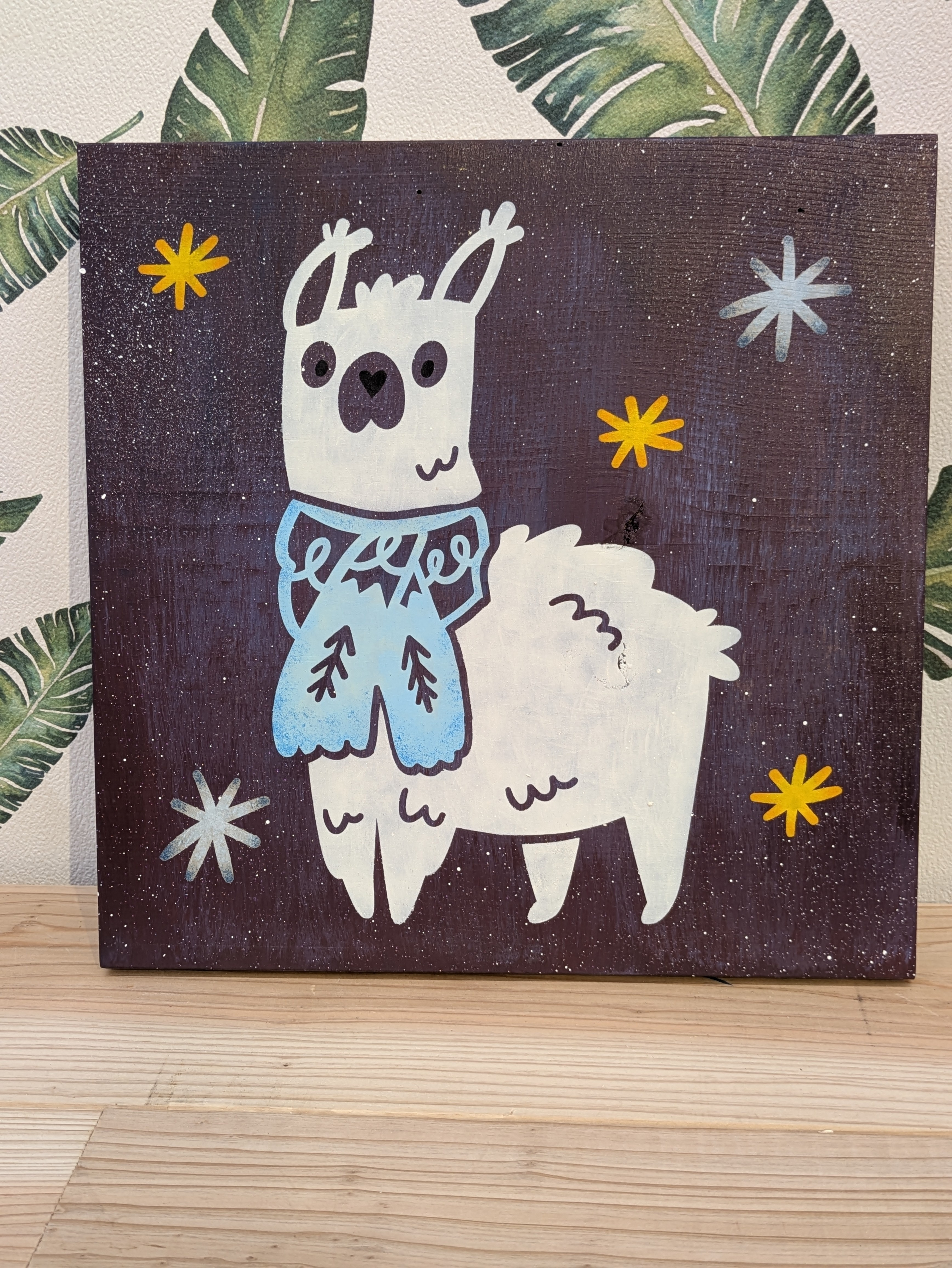 ラマちゃんのもふもふ感やマフラーのふわふわ感がステンシルから伝わってくるので、寒色カラーのボードなのに、あったかい雰囲気が出てます🥰