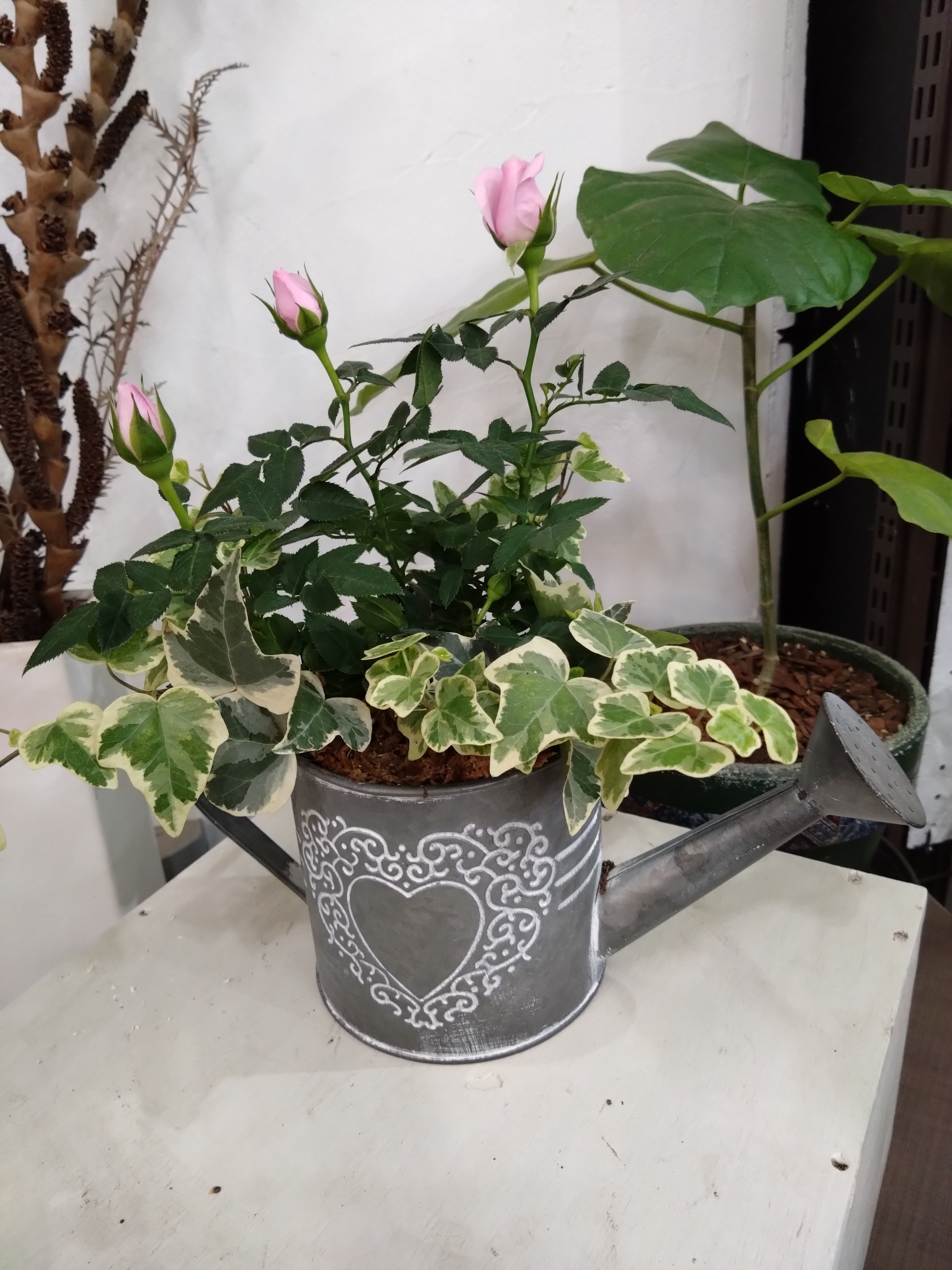 ブリキのじょうろにピンクの薔薇が映えてますね。