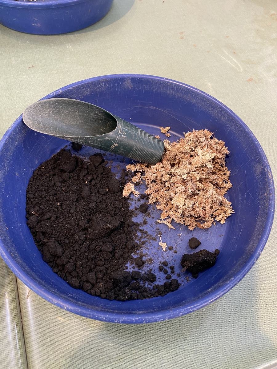 細かく砕いてだまが無くなるよう。そうすると水苔と黒土と混じりやすくなるそうです。