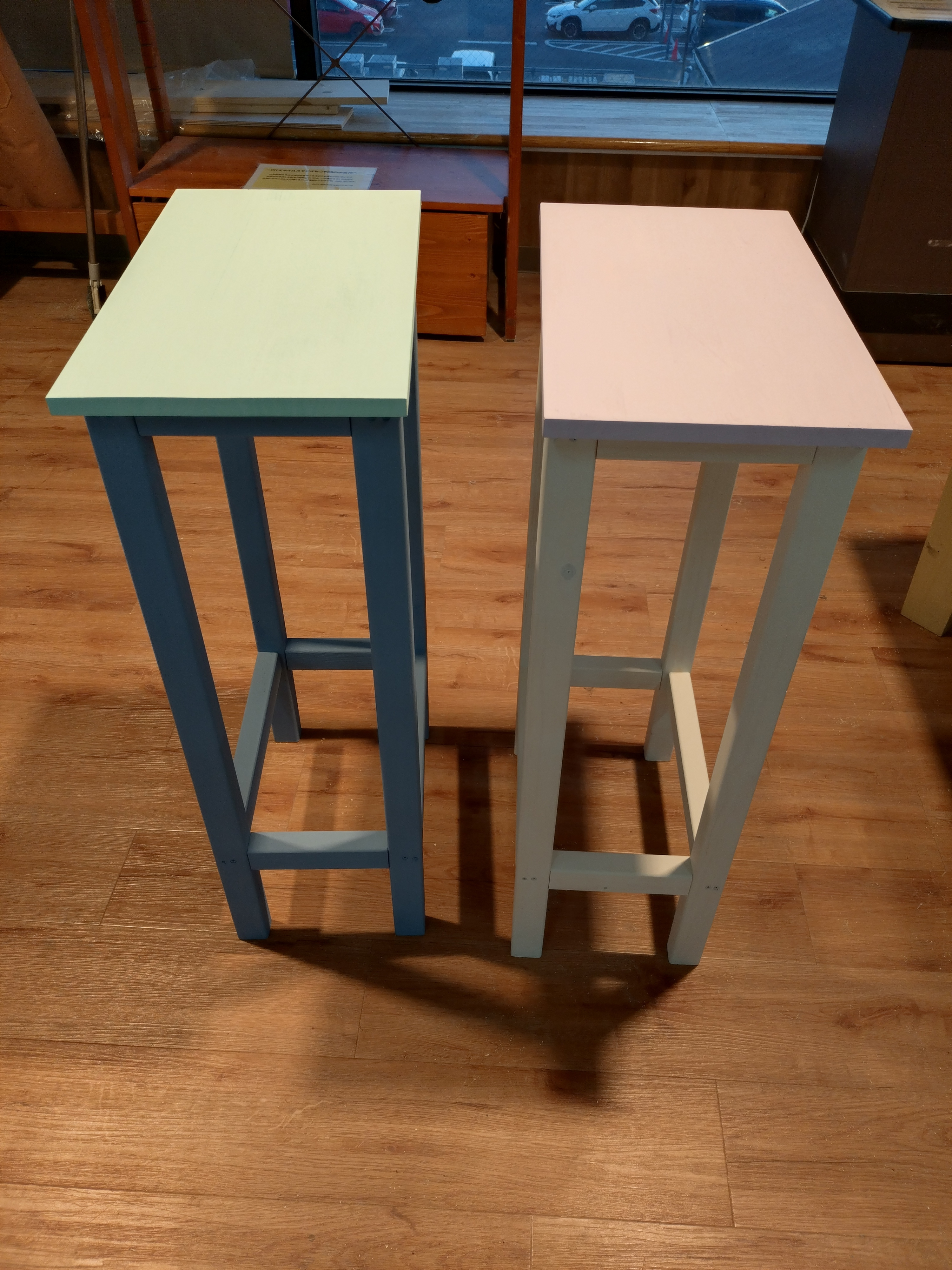 椅子は私には、1月に作った三脚スツールと最初で最後のパピィーの丸椅子がいい高さ✨テーブルは2つ並べてもいいサイズ感で、ちょっとした作業や食事もできます👍コンパクトなので、超撥水にしたらキッチンの補助テーブルにもいいかも🎶ニスを塗ったらいいのかな🤔