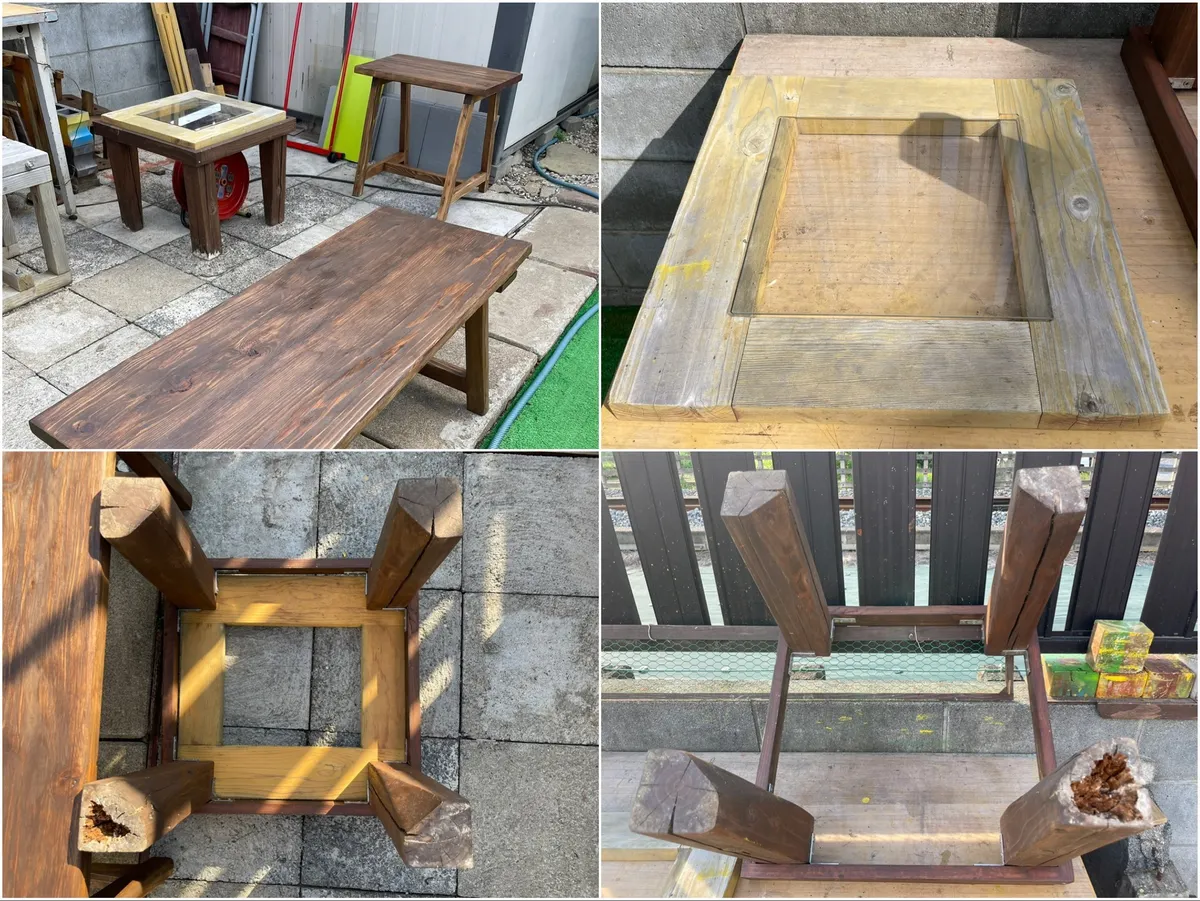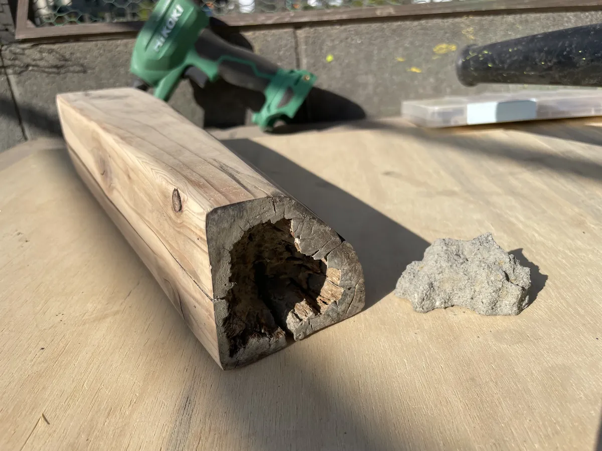 問題は、脚部一本の腐敗でした。置き場所が悪かったようで、ほじくればボロボロと。↑上の画像、右下の様子までになりました。