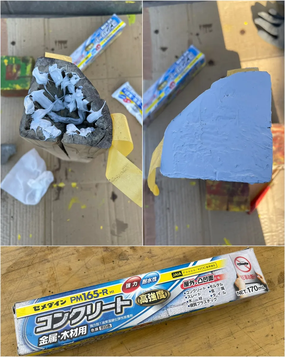 ↓外れたモルタルをコンクリート、金属、木材に使える強力&耐水性がある接着剤で埋め込む事にしました。