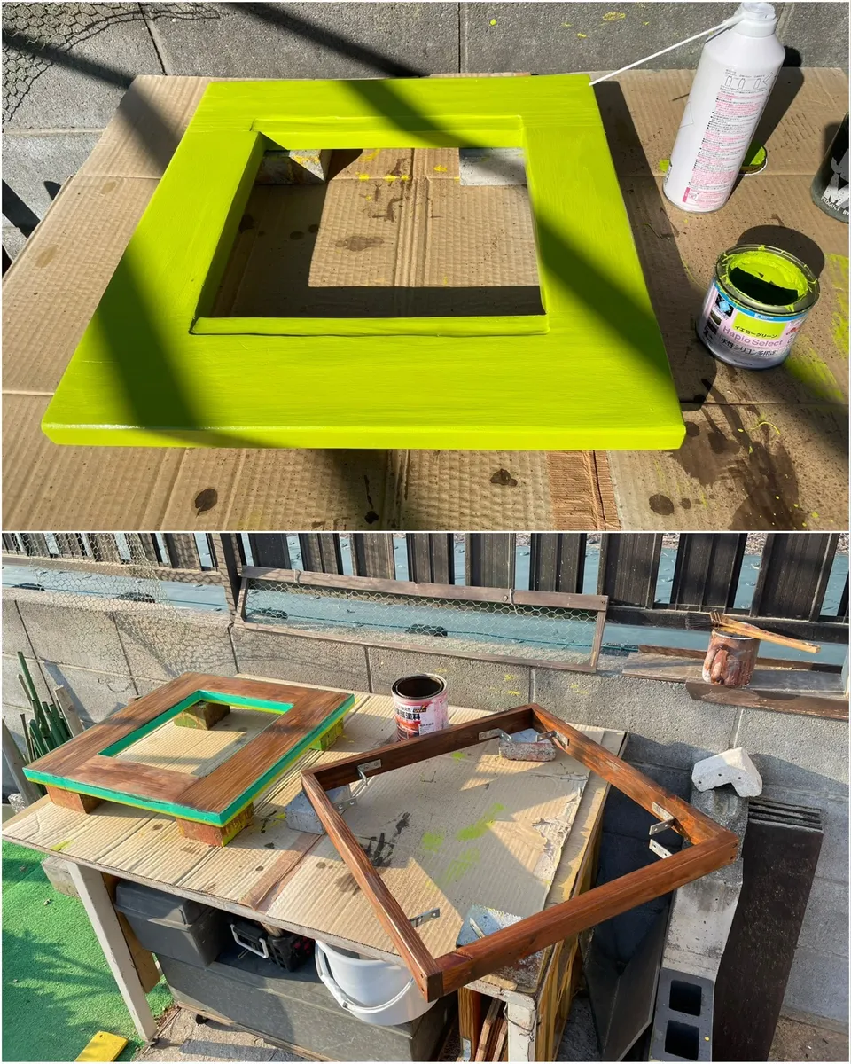 イエローグリーン塗装の天板部をはめ込んで、中央にガラス板(昔のテレビ台のガラス扉でした)を配置して完成です。