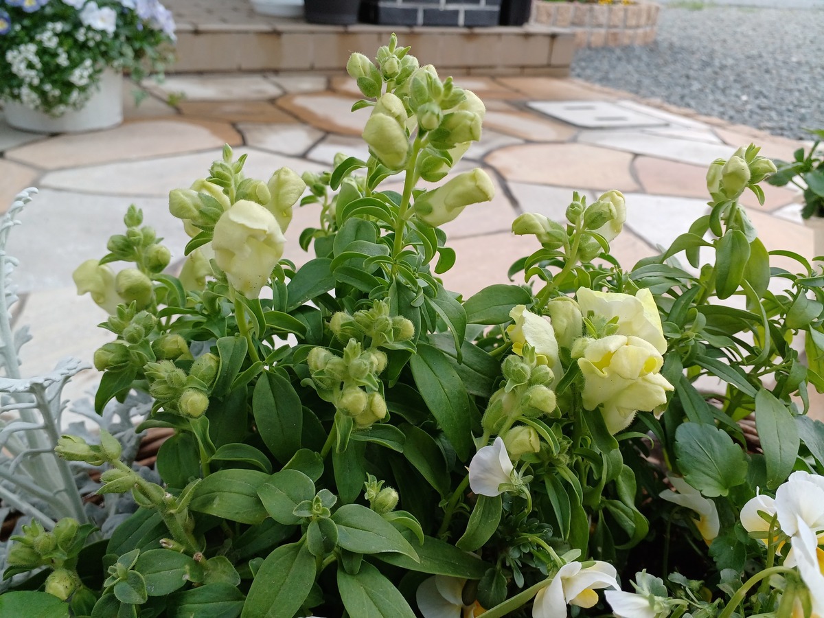 前からいたキンギョソウ、咲き始めて色がわかったのでこれに色を合わせて詰め込みました😆
