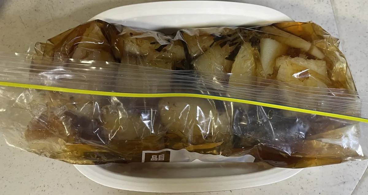 1本丸ごとより食べ易いかなと3つ切りにして、調味料煮た漬け汁冷ましたのをジッパーバッグに入れてブチ込むことにぃ〜🫡✨