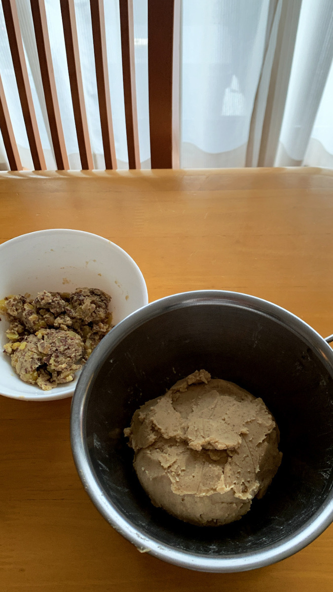 白い器に入っているのは、粒が大きくペーストにできなかったもので、スポンジに入れました。