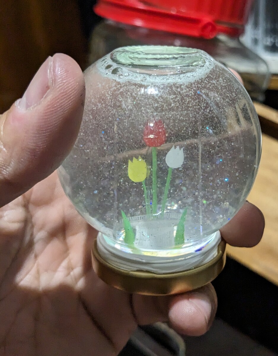 トップ > DIY > インテリア > スノードームの再製 おひで 2024/05/08 19:31 スノードームの再製 先日富山に行ったときに作ったスノードーム、 しまってたはずなんだけどなぁ帰って来る途中で蓋が緩んでしまって、液漏れしてしまったので、改めて作り直し。 慌てて精製水とグリセリンを買ってきて、中のキラキラがなくなってると思ったので、スパンコールを足して作り直しましたが、いざ作ってたら(洗わずに作ったので)キラキラがある程度残ってたので あ~よかった。ある程度再現ができました。 スパンコールがちょっと大きすぎたのですぐ落ちちゃいますが、飾って置くのは良さそうです。 いいね 共有する 共有する X LINE リンクをコピー コメントする 1 件の返信 (新着順) ミュートしたユーザーの投稿です。 投稿を表示 てんこ 2024/05/09 09:55 きれいですね 復活おめでとうです。 いいね 返信する