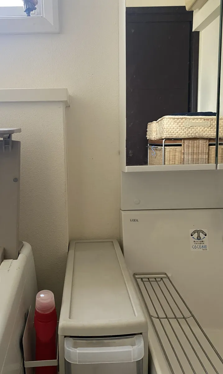 洗面台と洗濯機の間に微妙な奥行きの隙間があり、ここに隙間収納の引き出しを置いています。