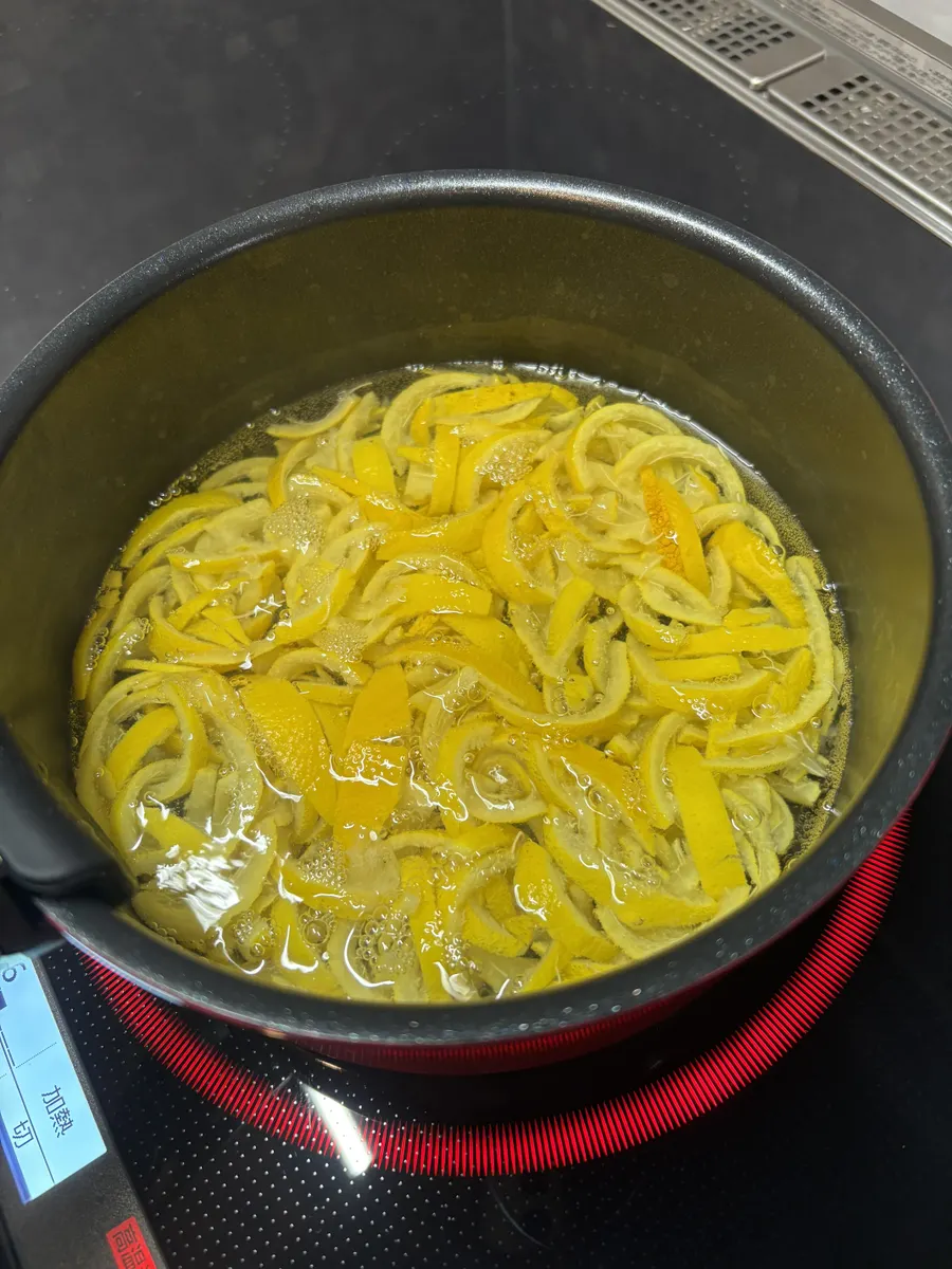 柚子の皮を千切りにして一度軽く茹で、苦味をとる(柚子はあまり苦くないので、やらなくても可)