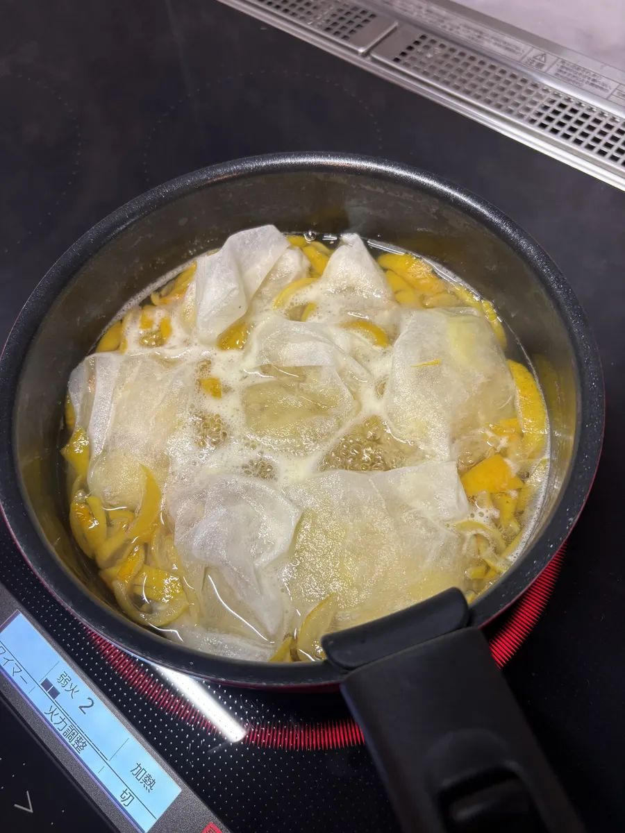 ゆずと砂糖、果汁を加えて、皮が浸るくらいまで水を足したら弱火でトロミがつくまで煮込む。