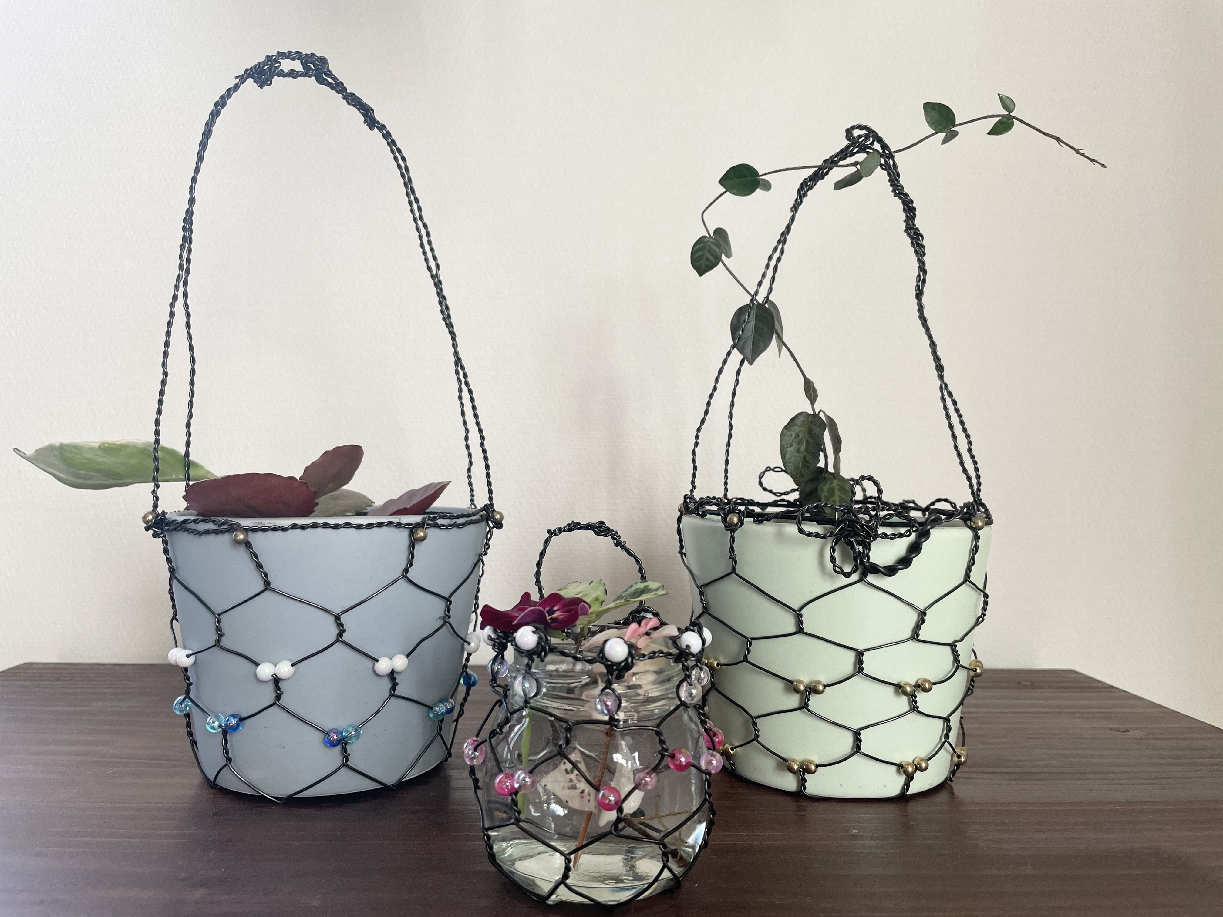 カラー鉢に、ワイヤークラフト!ビーズを入れて、組み上げていきます。WSで作った物が気に入って、材料を買い、自宅でもいくつか作りました😊