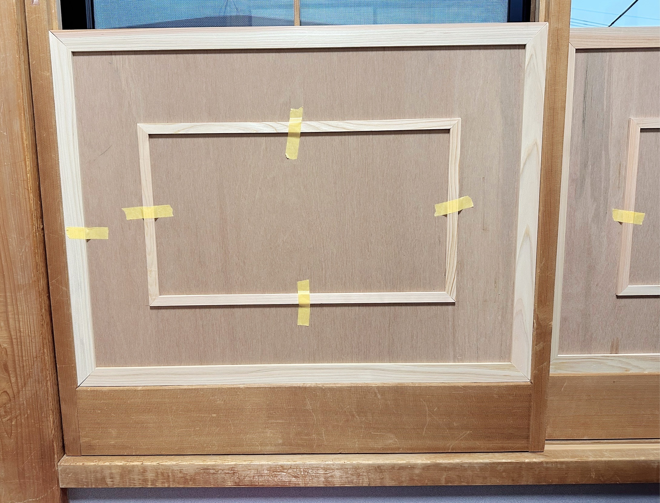 窓になる部分にはじめは中心に一本だけ桟を残しましたが、十字にしました