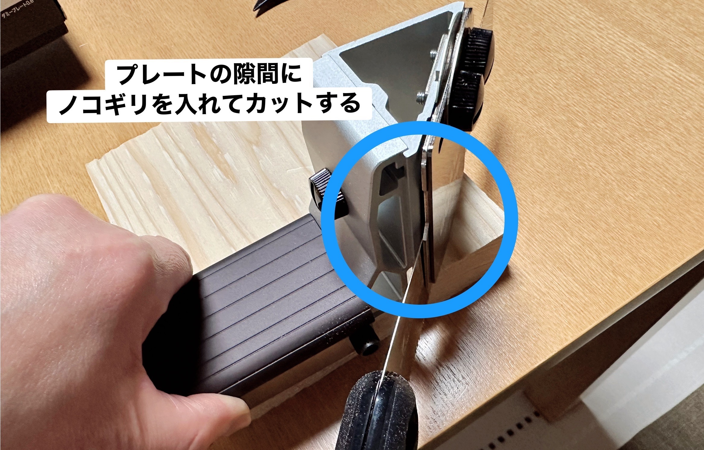 ↑この写真は急遽見本用に撮っただけなので、実際は作業台にクランプ🗜️で留めてカットしました!ガイドプレートの隙間にノコギリを入れてカットします