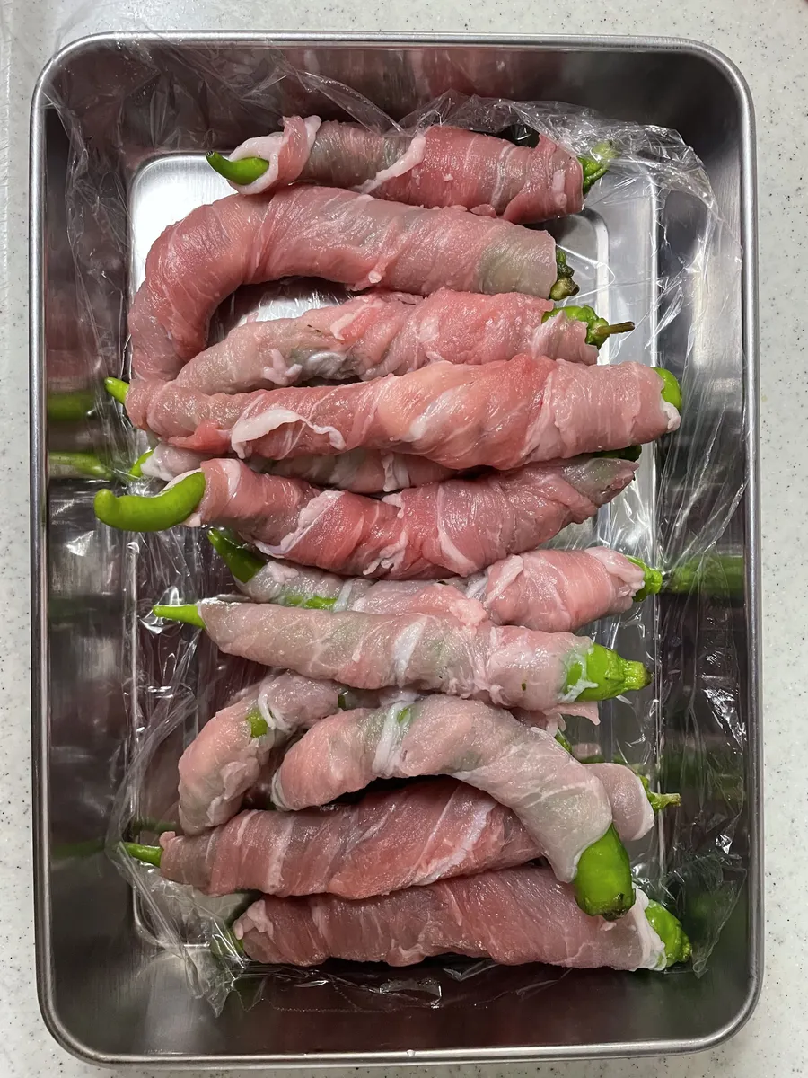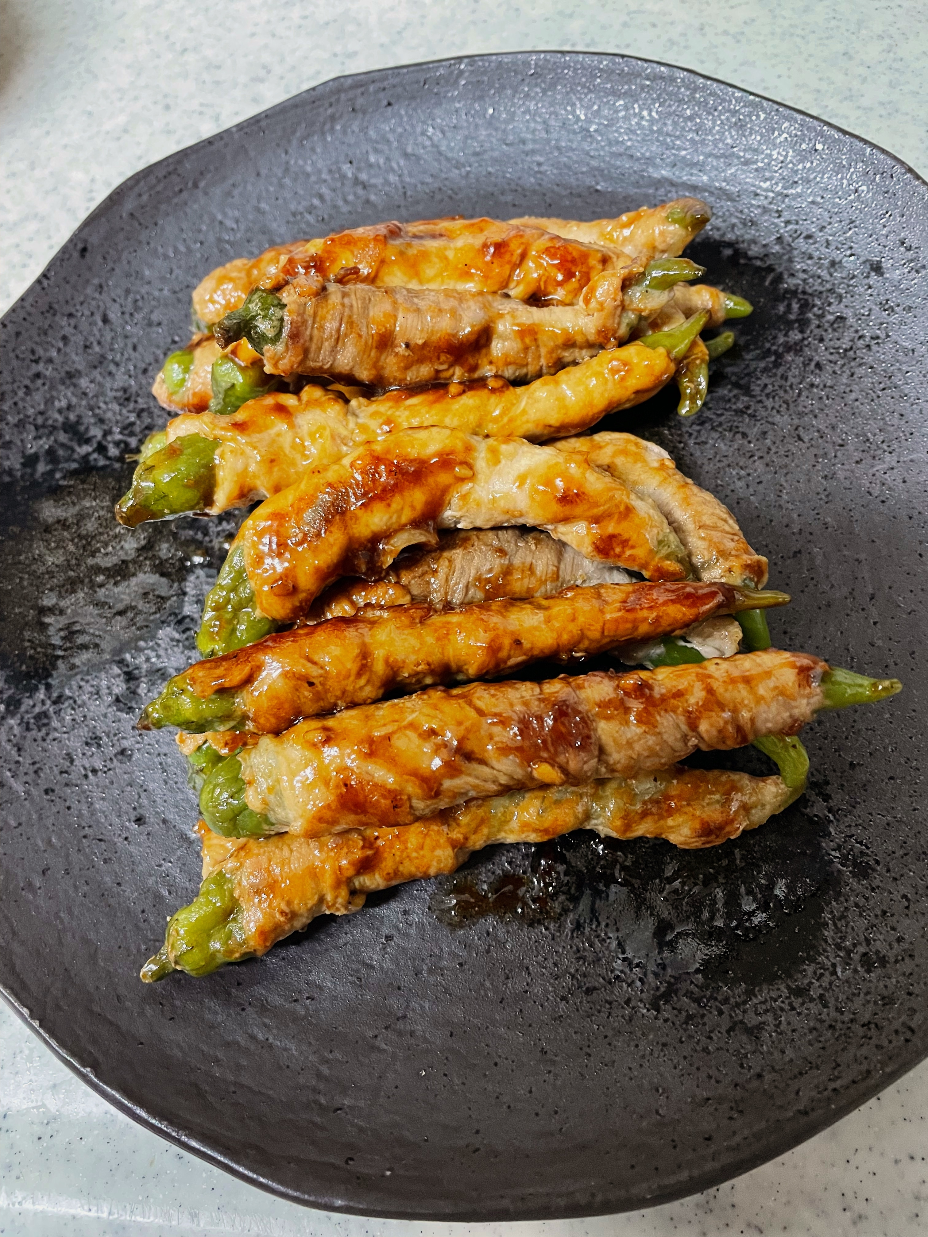 私は面倒くさがりなので、唐辛子にそのままお肉を巻き巻き🌀