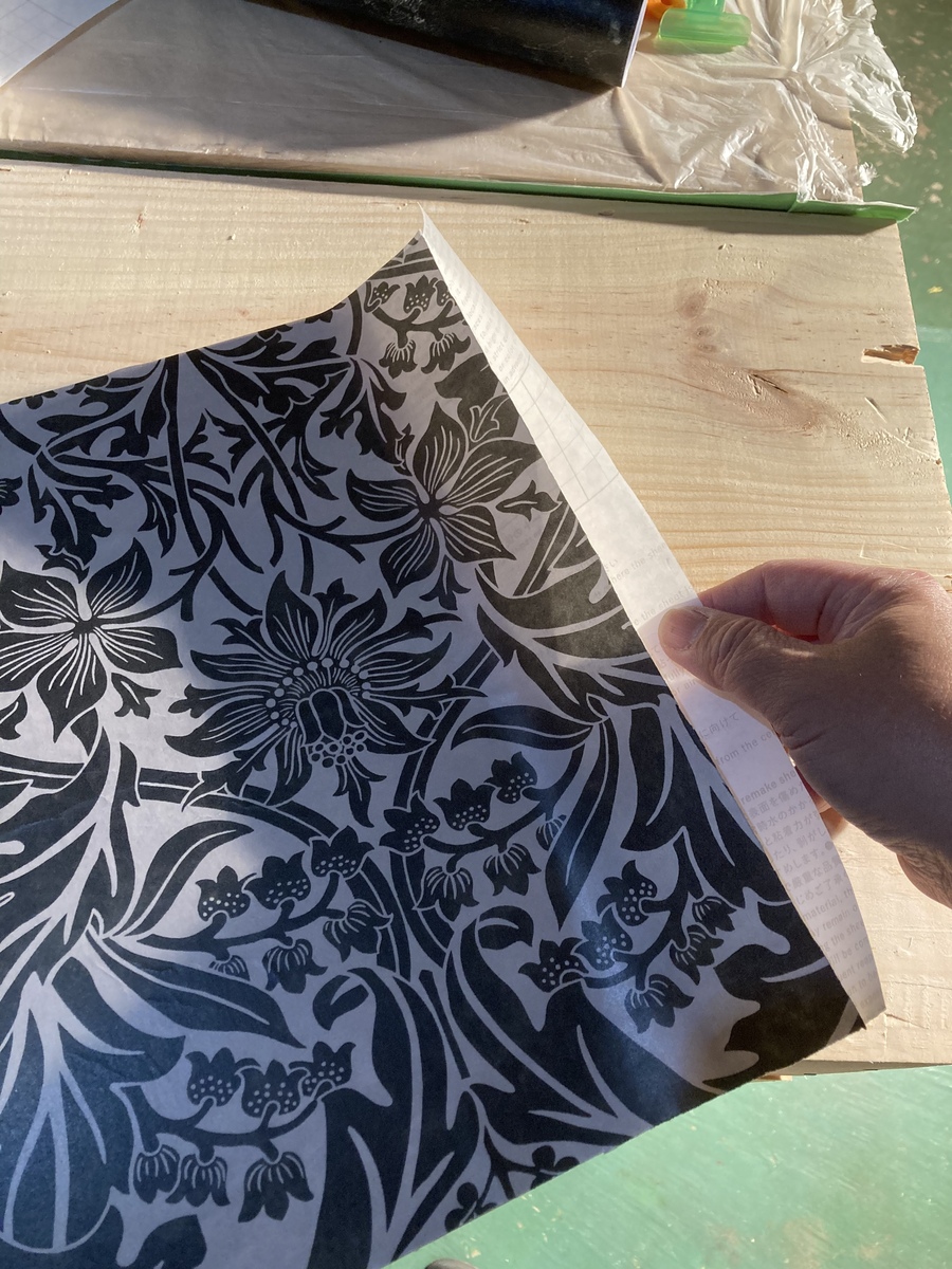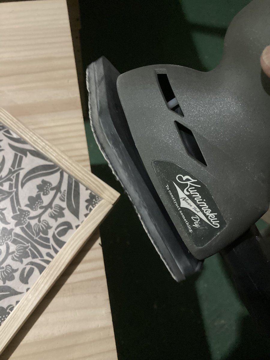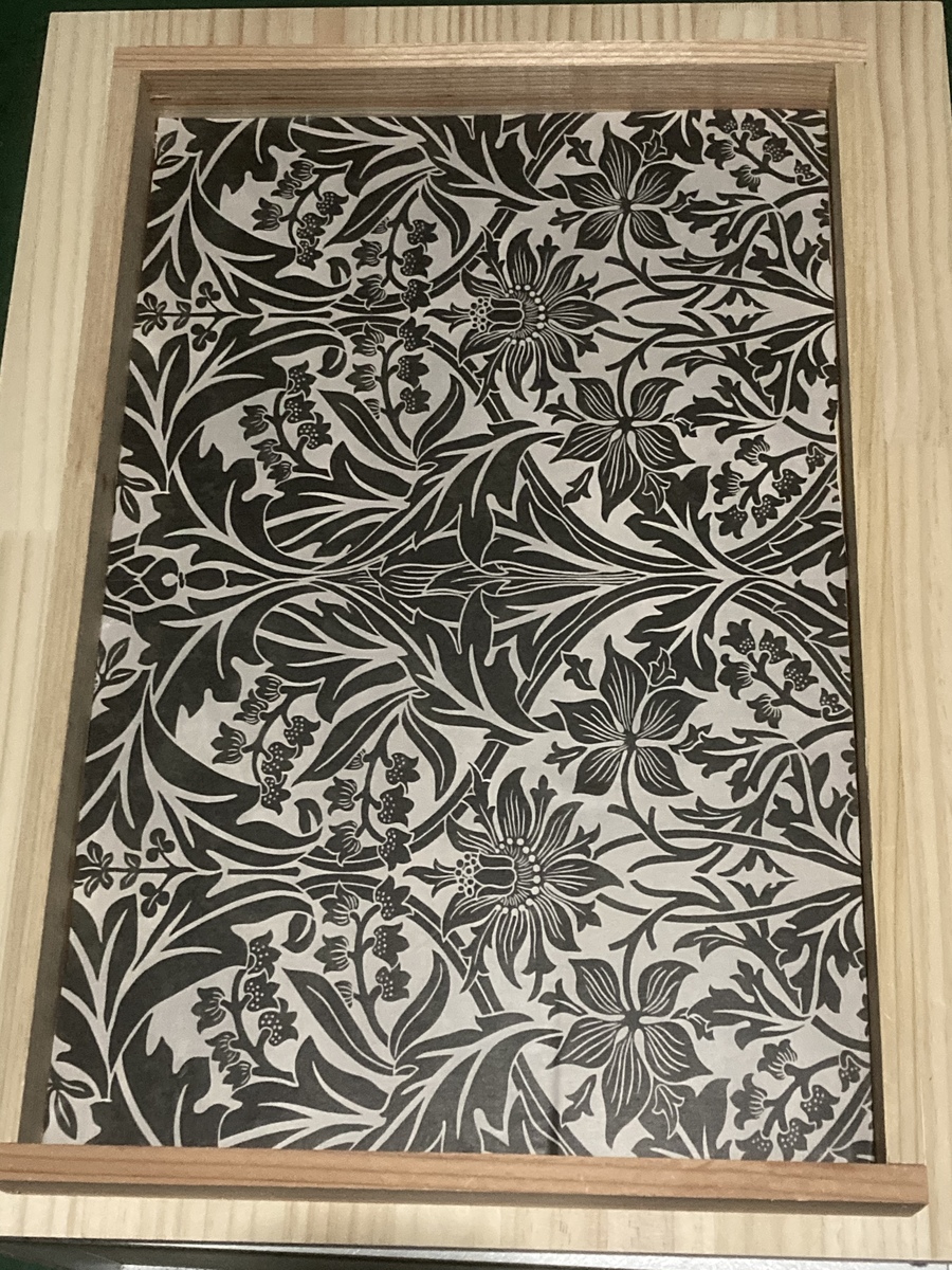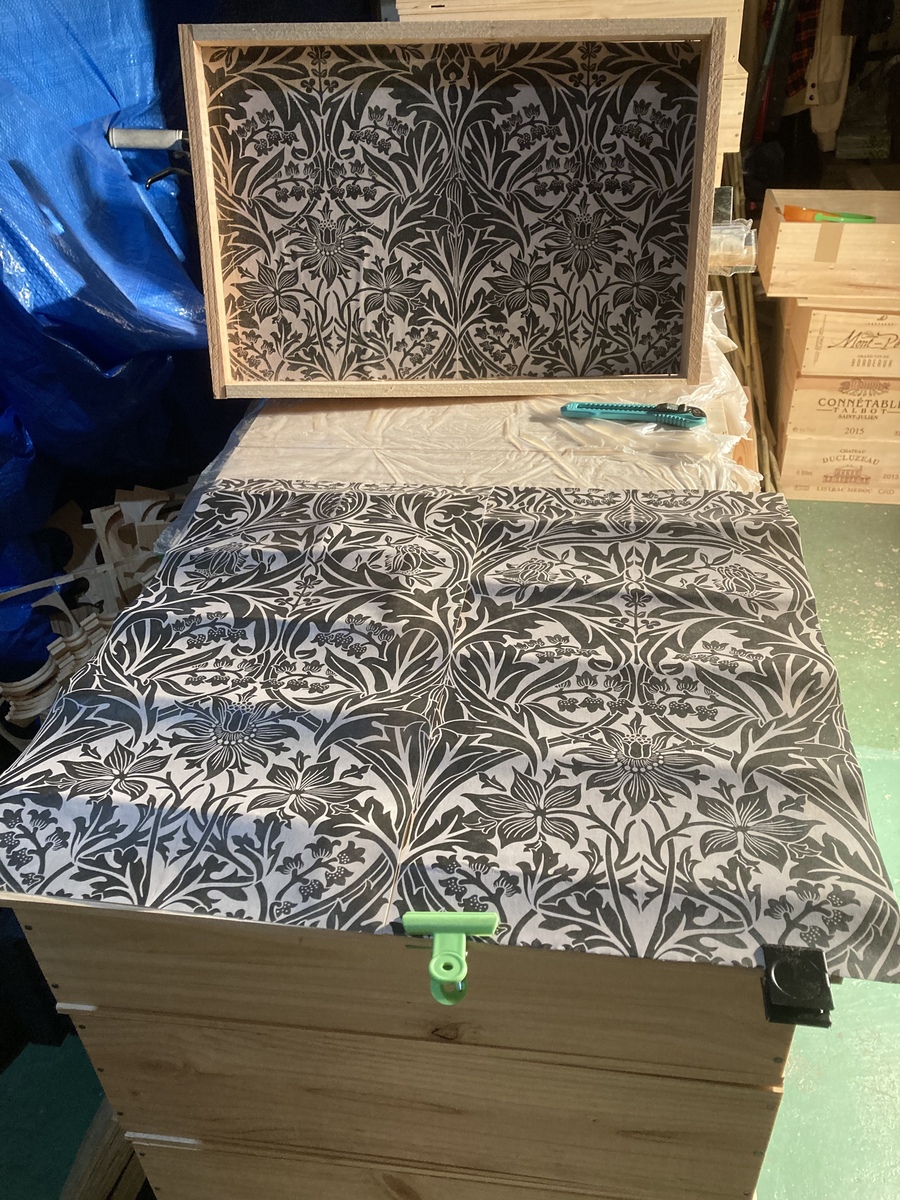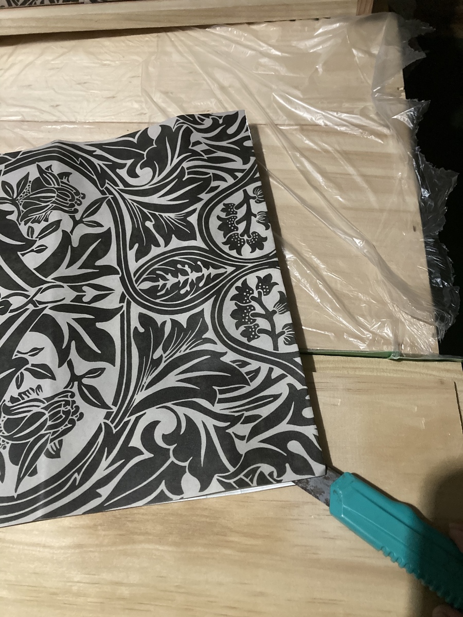 ↑柄合わせをして、木箱蓋より少し大きめにカットします