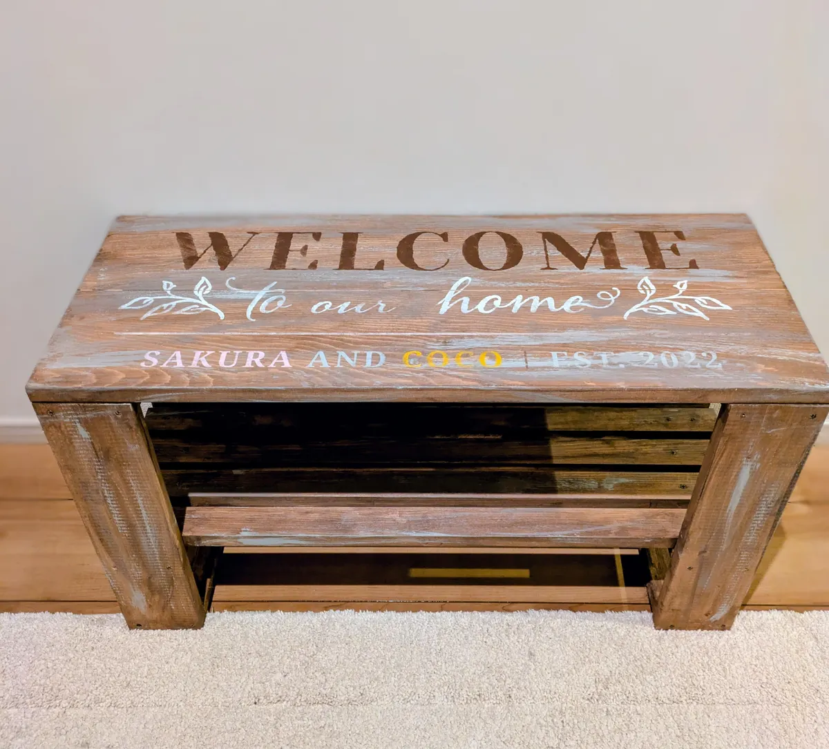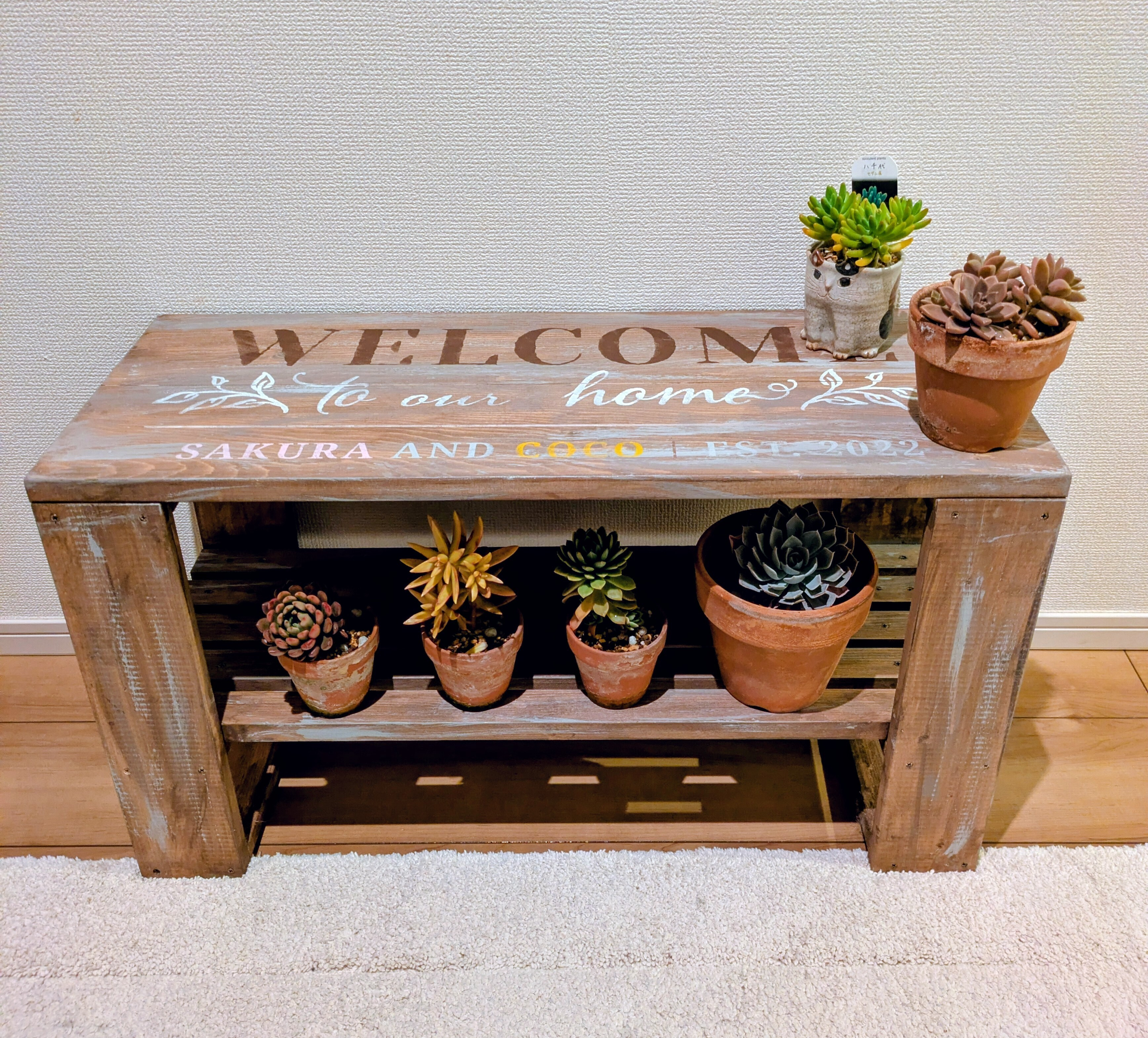 トップ > ワークショップ > キャンペーン > B&Bのあるくらし サクラ 2026/01/09 20:37 B&Bのあるくらし 2025年春頃、初めてB&Bワークショップに参加して仕上げた作品です。記念にペットの名前を入れてみました。ベースカラーは大好きなウォルナット、ヴィンテージ感は今一つですが、オリジナルなところが気に入っています。 しっかりしているので、使い方は無限?です。 椅子として、踏み台として、インテリアとしてなどなど。玄関の狭い廊下にWelcomeボードとして設置しました。スリッパやカバンを置いたり、最近は多肉植物たちが凍らないように、夜はこうして玄関の中に避難しています。 Board&Brushのあるくらし いいね 共有する 共有する X LINE リンクをコピー コメントする 3 件の返信 (新着順) ミュートしたユーザーの投稿です。 投稿を表示 toshi 2026/01/10 08:23 色合いといい、置いてある物といい、とても合ってますね ステキです😊 いいね 返信する ミュートしたユーザーの投稿です。 投稿を表示 チコリ 2026/01/10 01:57 ほんと使い方無限ですね♾️ 多肉とも相性バッチリ😊 私も作りたいです🎶 いいね 返信する ミュートしたユーザーの投稿です。 投稿を表示 mi 2026/01/09 21:21 B&Bはどの作品も素敵です💓 私も大好き❤ いいね 返信する