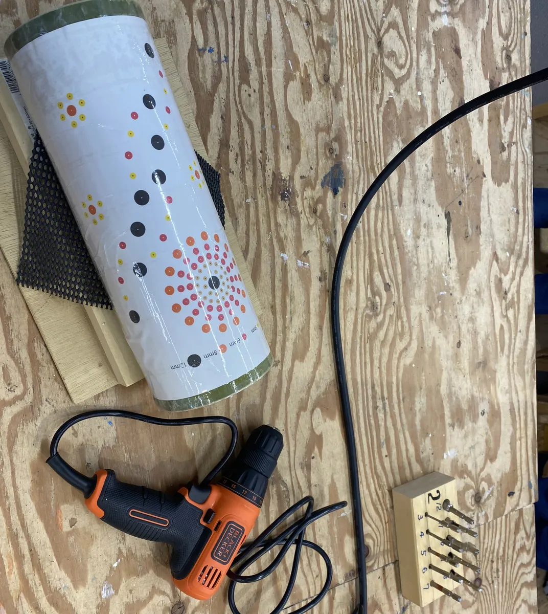 竹に開けるビットサイズが書いてある紙を貼りまして、どんどんひたすら開けていきます💪