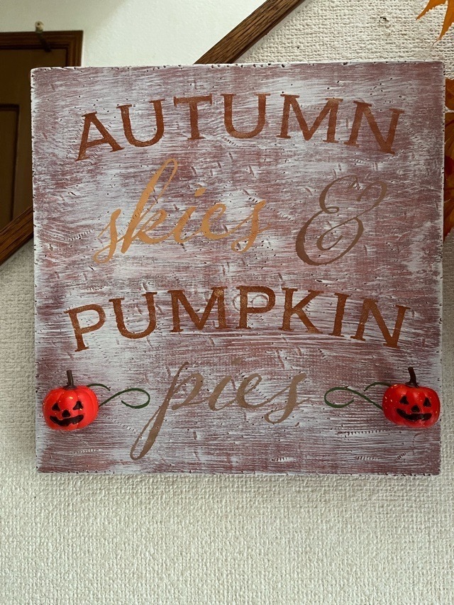 先日、秋バージョンでサインボードを作ってコメントにみーたんさん(勝手にお名前出してすみません🙏)からかぼちゃを付けるアレンジを教えて頂いたので付けてみました🎃