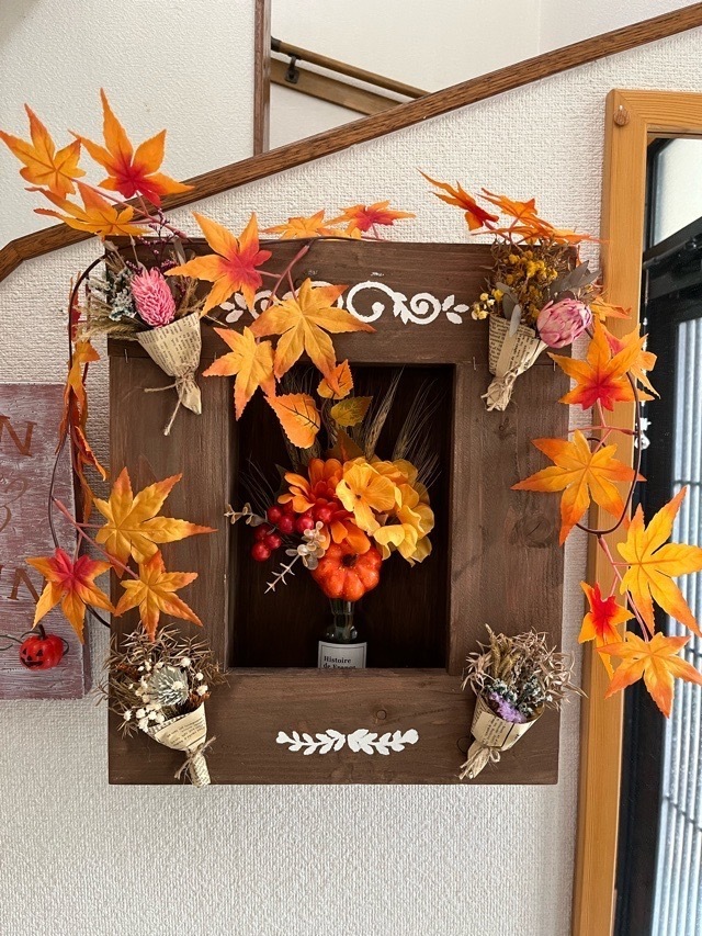 そして、フラワーフレームには秋らしいアレンジメントをして紅葉を飾ってみました🍁