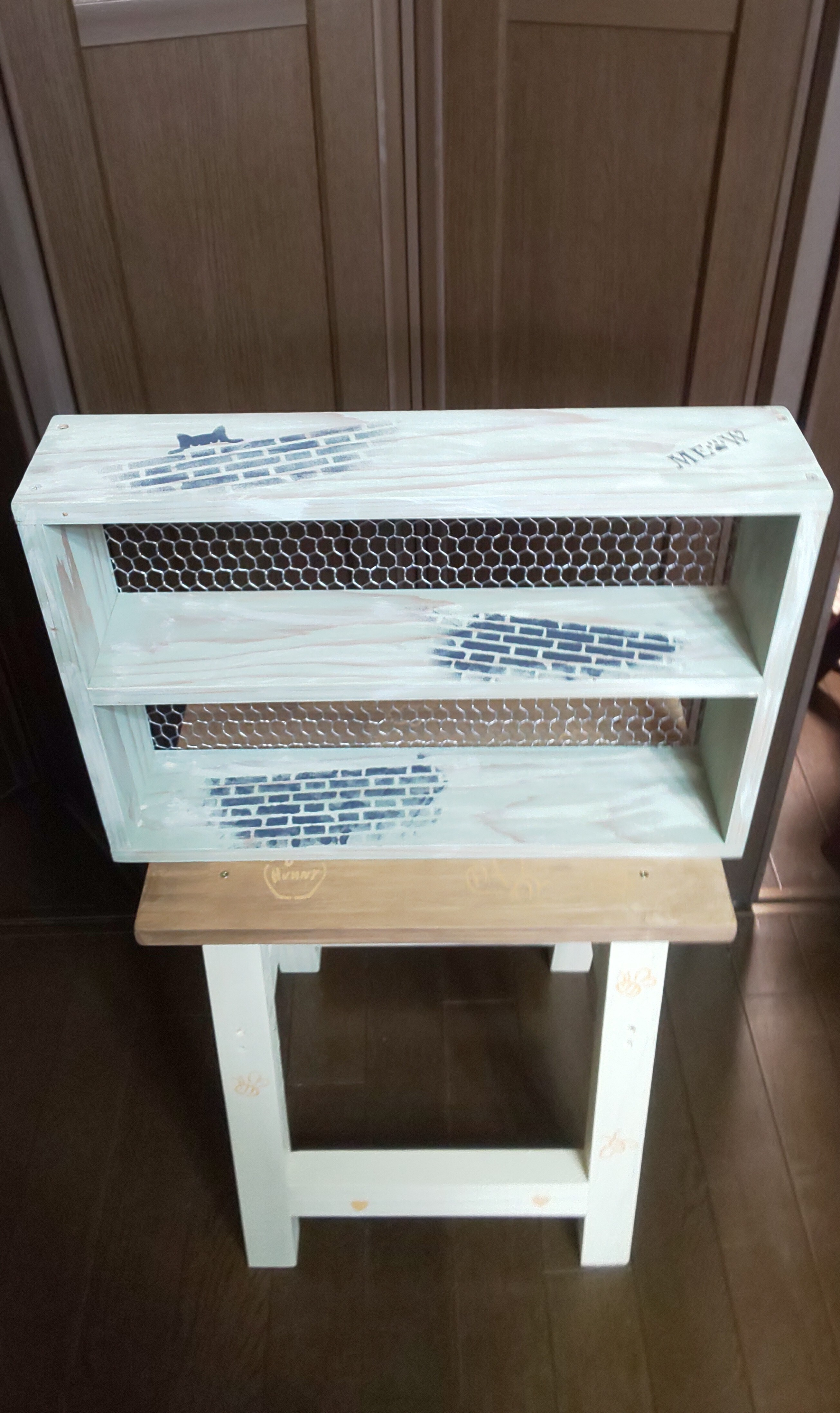 投稿を表示猫ちゃんが半分顔を出してるステンシル、汚し風塗りの゙棚にとってもよく似合ってますね🧡。